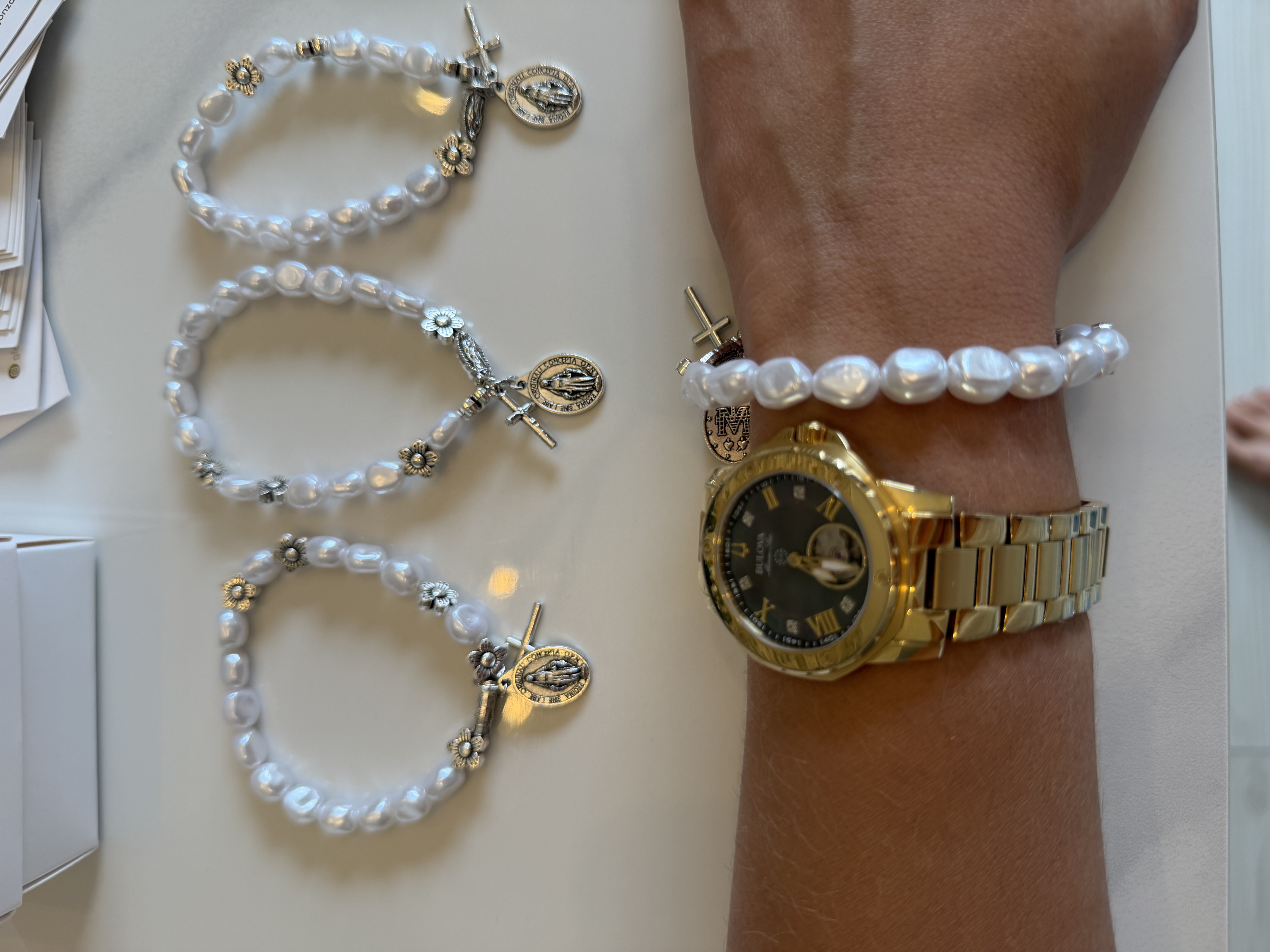 Delicado, elegante y lleno de significado. Nuestro Escapulario Perla Real Dorado combina la belleza natural de las perlas con el brillo sofisticado de los detalles en tono dorado, creando una pieza atemporal que realza cualquier look.