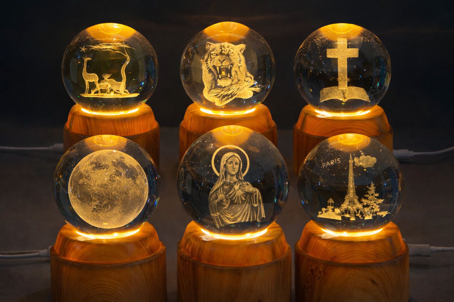 Hermosa esfera de cristal con grabado 3D interno y base iluminada tipo madera.