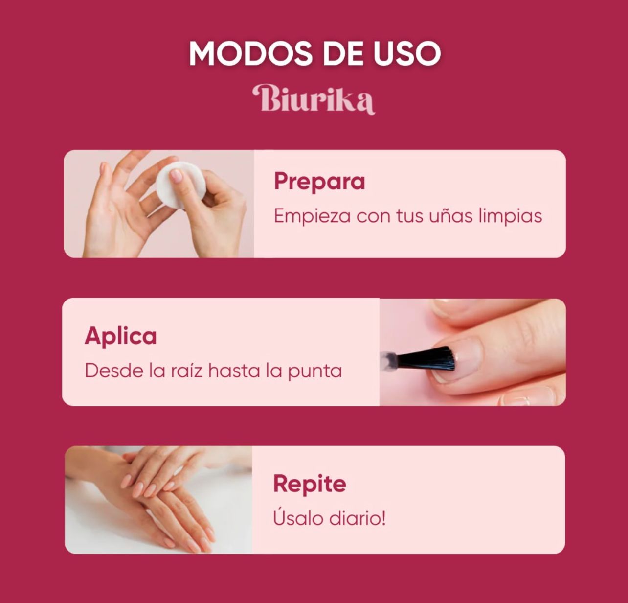 Descubre el secreto de unas uñas más fuertes, sanas y hermosas con el Esmalte Endurecedor BIURIKA: un tratamiento innovador que no solo protege, sino que estimula el crecimiento natural de tus uñas. Su fórmula avanzada actúa desde la base, reparando uñas frágiles, quebradizas o con tendencia a partirse, ya sean cortas o largas.