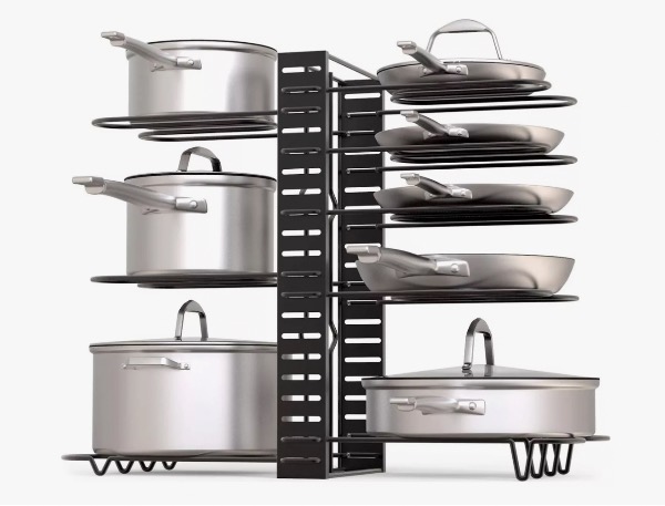 * Gran capacidad de almacenamiento Este soporte de altura y posicion ajustable almacena hasta 9 sartenes sartenes parrillas o ollas de varios tamaños. Es una solucion perfecta para guardar todo el recipiente y la sarten ahorrando mucho espacio en la cocina o en el armario y encimera.