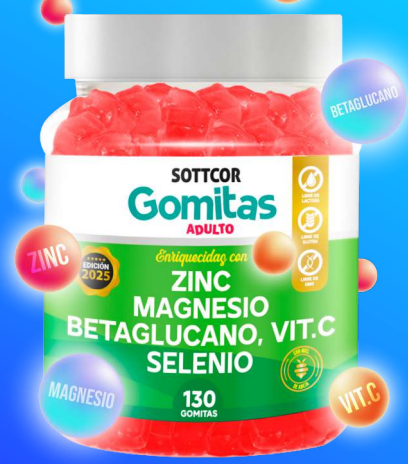 Descubre las Gomitas Adulto de Zinc, Magnesio, Betaglucano, Vitamina C y Selenio de SOTTCOR, un suplemento nutricional diseñado para apoyar el bienestar diario de forma práctica y deliciosa. Cada frasco contiene 130 gomitas con una combinación de nutrientes esenciales que ayudan a complementar la alimentación de los adultos.