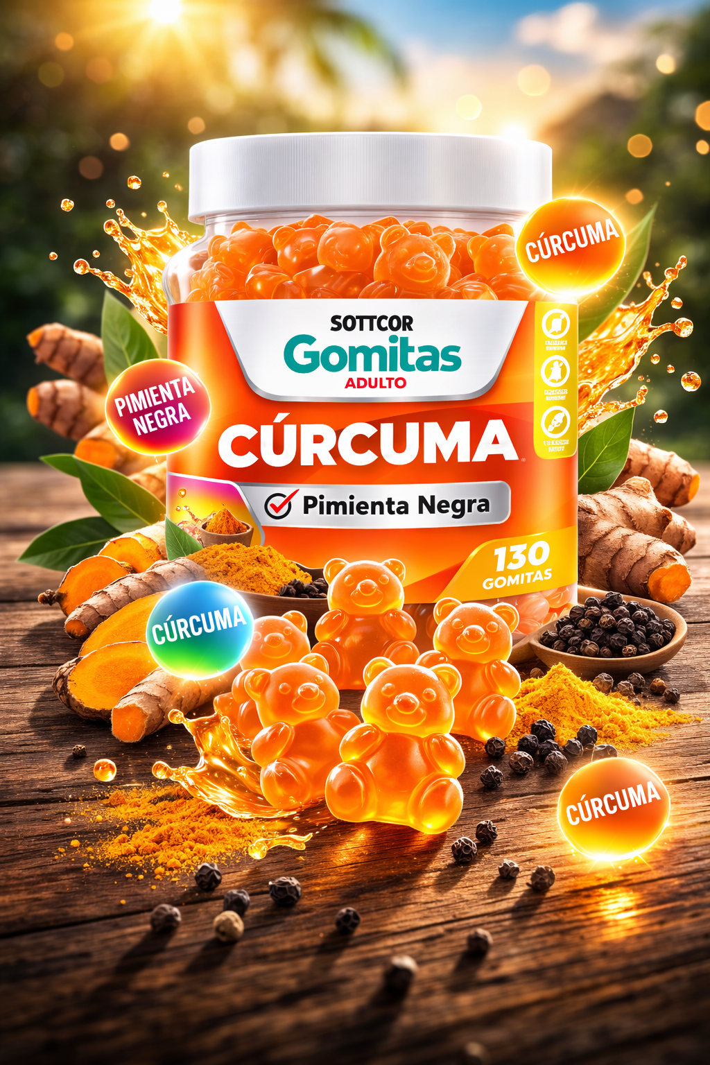 Descubre las Gomitas de Cúrcuma SOTTCOR, un suplemento nutricional diseñado para quienes buscan complementar su rutina diaria de una forma práctica, deliciosa y fácil de consumir. Cada frasco contiene 130 gomitas en forma de osito, elaboradas con cúrcuma y pimienta negra, en una presentación cómoda y moderna para adultos.