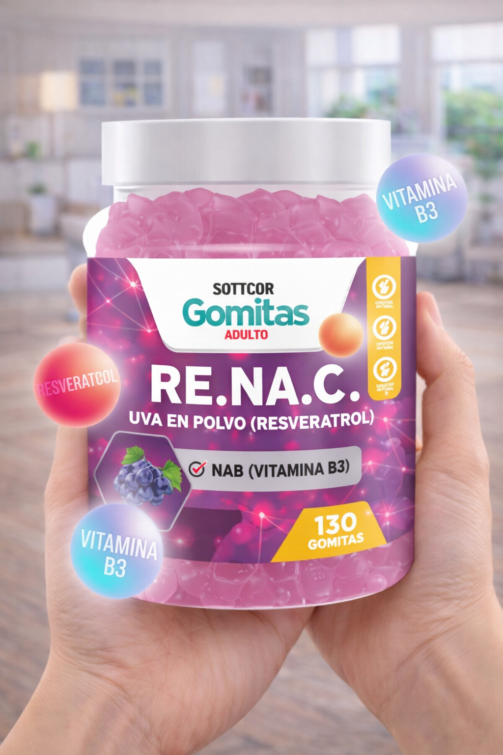Descubre las Gomitas RE.NA.C. de SOTTCOR, un suplemento nutricional diseñado para quienes buscan complementar su rutina diaria de una forma práctica, deliciosa y fácil de consumir. Cada frasco contiene 130 gomitas en forma de osito, elaboradas con uva en polvo (resveratrol) y NAB (vitamina B3), en una presentación moderna y cómoda para adultos.