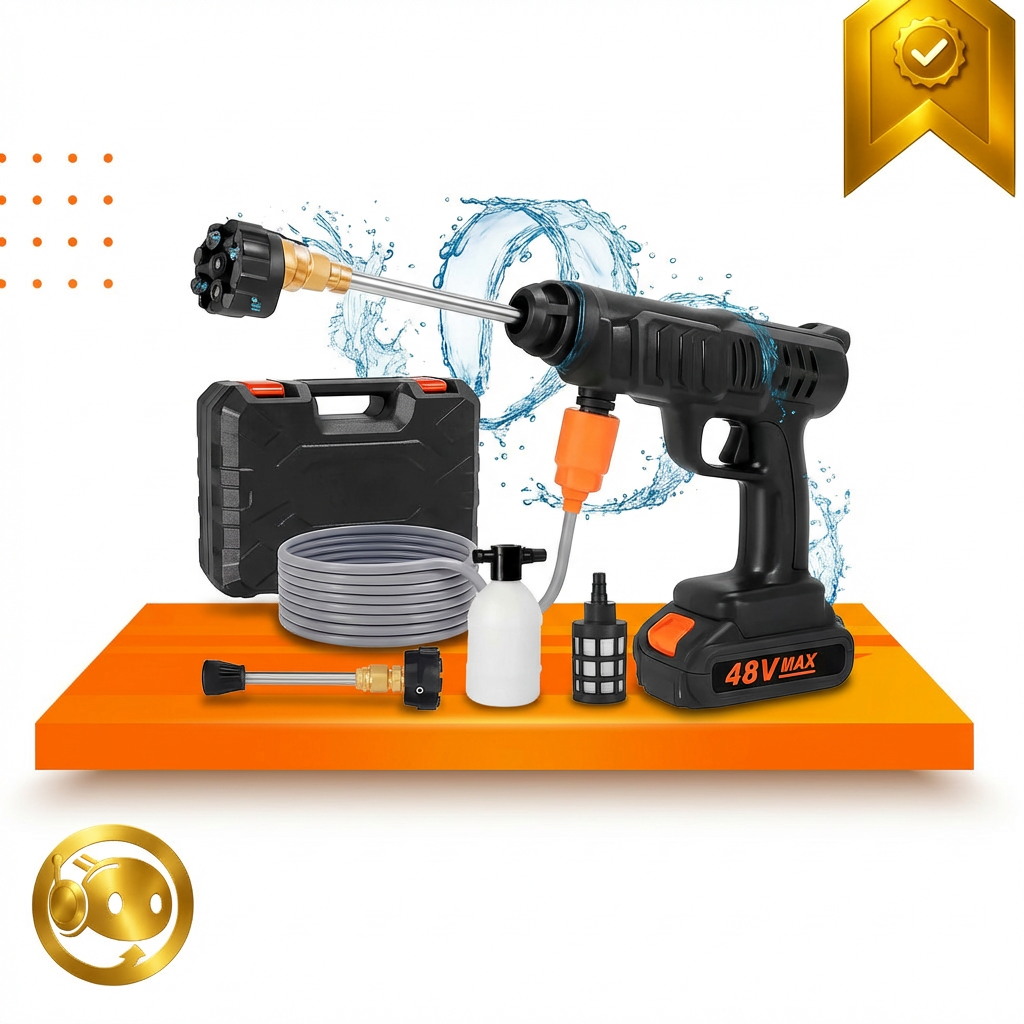 Hidrolavadora portátil inalámbrica de 48W con 2 baterías recargables, ideal para limpiar auto, moto, bicicletas, patios y muebles de jardín sin necesidad de enchufe. Incluye manguera de succión, filtro, botella para espuma, 5 boquillas intercambiables y maletín rígido para transporte, ofreciendo limpieza rápida, eficiente y con menor consumo de agua.
