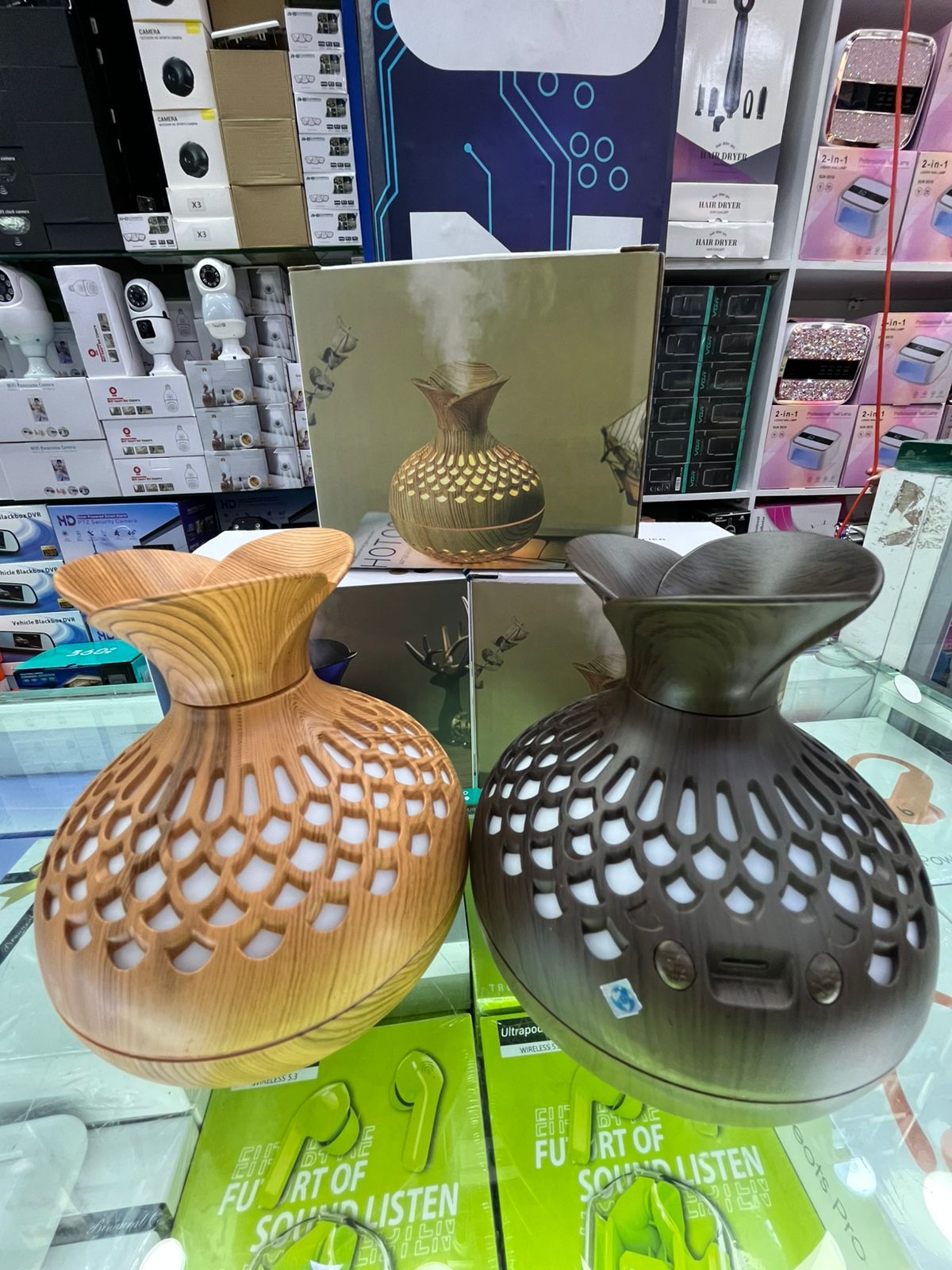 Este Humidificador y Difusor con acabado en madera no es solo un aparato, es una pieza de decoración que cuida tu salud. Su tecnología ultrasónica crea una niebla fina que hidrata tu piel y purifica el aire, mientras su diseño de jarrón tallado deja salir una luz LED ambiental que cambia de color. 🌈✨