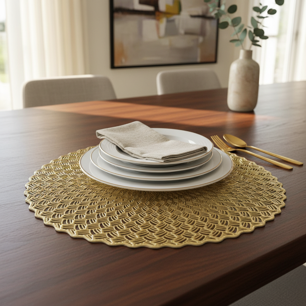 Realza la estética de tu comedor con este individual de diseño troquelado. Su patrón de círculos entrelazados crea un juego de luces y sombras sobre la mesa, ofreciendo un aspecto sofisticado y contemporáneo. El acabado dorado metalizado aporta el brillo ideal para transformar cualquier comida en una ocasión especial.