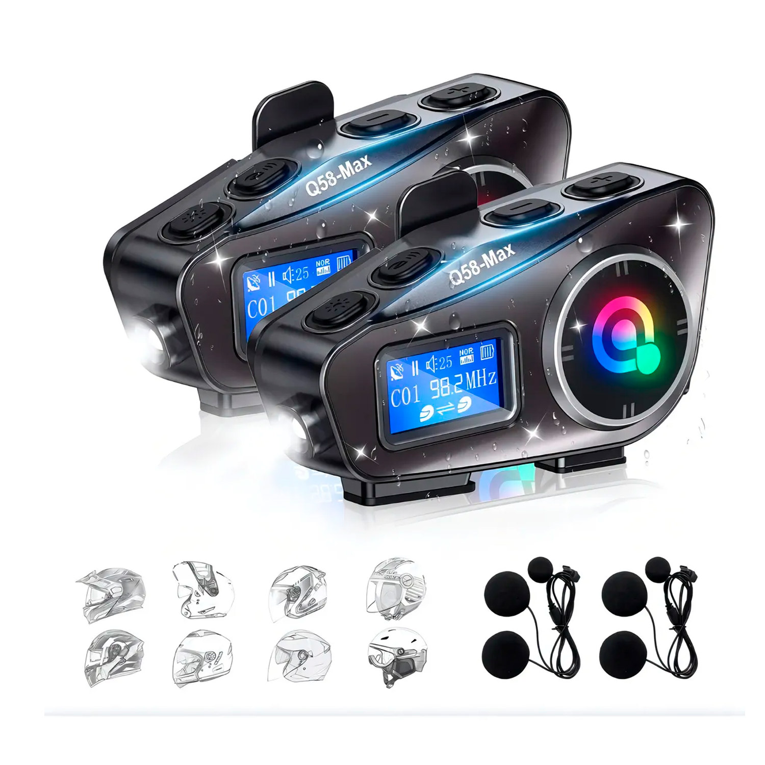 🔍 Características básicas (mismo tipo de dispositivo) En general, estos modelos Q58 (incluyendo las versiones Max, RGB, Duo/DT o kit de 2 unidades) comparten estas características: 📶 Conectividad Bluetooth 5.3 (o similar) para enlace con tu smartphone y otros dispositivos. Intercomunicador bidireccional para comunicarte con otro piloto o copiloto. Permite hasta 2 motociclistas conectados simultáneamente. Compatible con Android e iPhone para llamadas, música y GPS. 📡 Alcance Alcance típico de intercomunicación hasta ~500 m en campo abierto entre dos unidades. Algunas versiones mencionan incluso hasta ~800 m de alcance en condiciones óptimas. 🎧 Funciones de audio Reproducción de música vía Bluetooth o desde tarjeta micro SD (soporta 4–32 GB). Radio FM integrada en muchos modelos. Reducción de ruido CVC + DSP para mejorar claridad de voz y música. 📞 Comunicaciones y uso Llamadas manos libres mientras conduces. Auxiliar de voz digital (aunque puede variar según versión). Control mediante botones accesibles incluso con guantes. 🪫 Batería y resistencia Batería recargable con hasta ~25 h de uso continuo y muchas horas adicionales en espera. Carga rápida por USB-C. Resistencia al agua y polvo (certificación IP65/IPX5-6) para uso en lluvia o polvo. 📺 Pantalla y controles Algunos modelos incluyen pantalla LCD o LED que muestra estado, batería, emisoras FM o modo activo. A veces incluyen efectos de sonido (EQ) o luces LED RGB (en versiones específicas). 📌 En resumen El Intercomunicador Q58 Max Bluetooth Casco Moto FM Música 25 h y sus variantes como el Intercomunicador Bluetooth para Casco Q58 Max o el Intercomunicador Pareja Casco Moto Q58 Bluetooth Música X2 son dispositivos populares económicos con funciones completas para uso diario: ✔ Intercomunicación entre dos motociclistas (~500 m) ✔ Bluetooth para teléfono + música + GPS ✔ Radio FM y reproducción desde micro SD ✔ Batería para todo el día ✔ Resistente al agua (ideal para lluvia) 👉 Las versiones DUO / Pack X2 / Max normalmente vienen en juegos de dos unidades o con pantalla integrada y funciones mejoradas como luces RGB y asistente de voz.