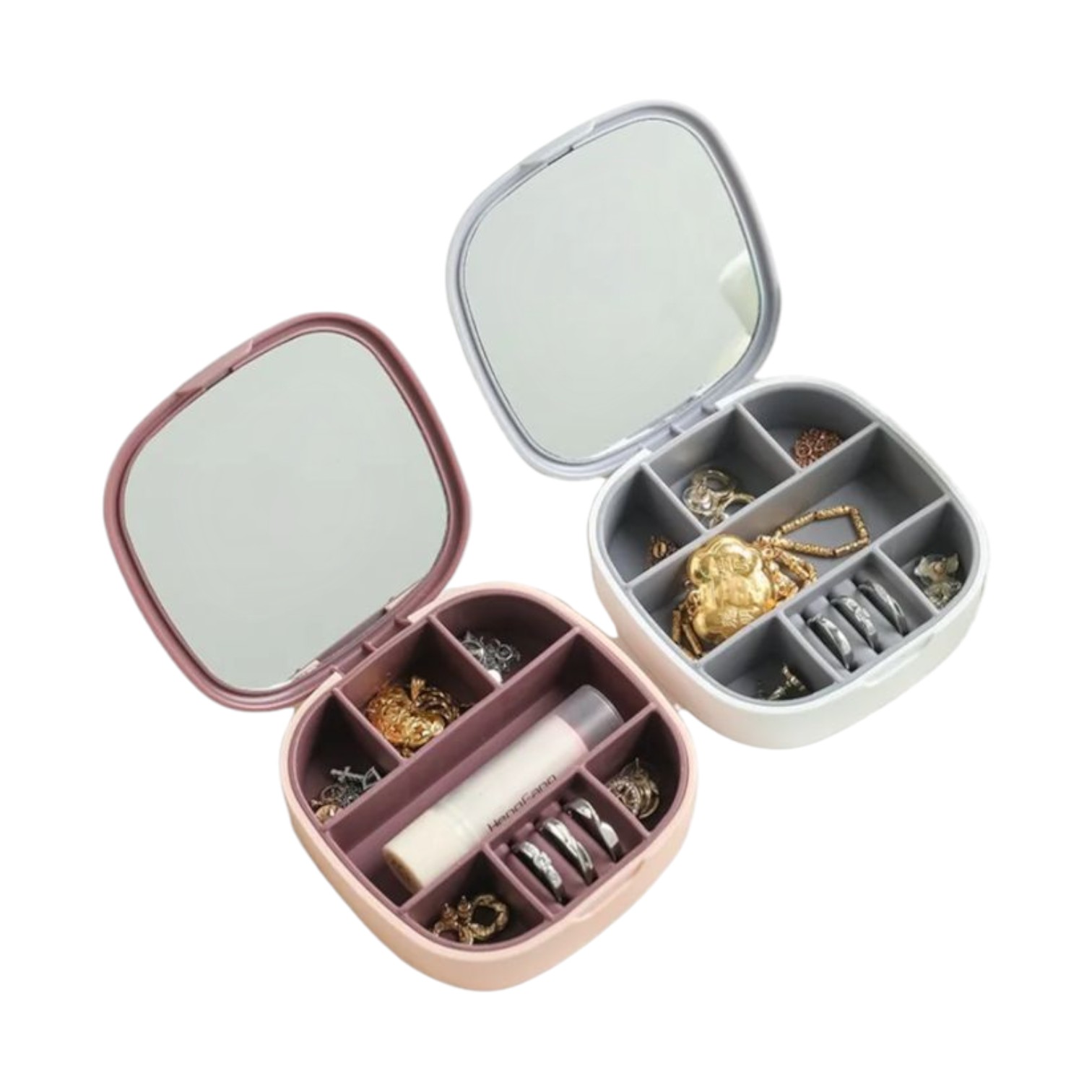 Guarda tus joyas y tenerlas seguras en viajes o en el hogar con esta practica caja organizadora con espejo lo que te permite cambiar y llevar tus accesorios en cualquier momento y en cualquier lugar. Será la solución perfecta de almacenamiento para esos accesorios de gran valor que queremos llevar a todas partes. Tiene broche de seguridad para que no se abra fácilmente con el transporte, divisiones de diferentes tamaños para guardar aretes, cadenas, anillos y mucho más.
