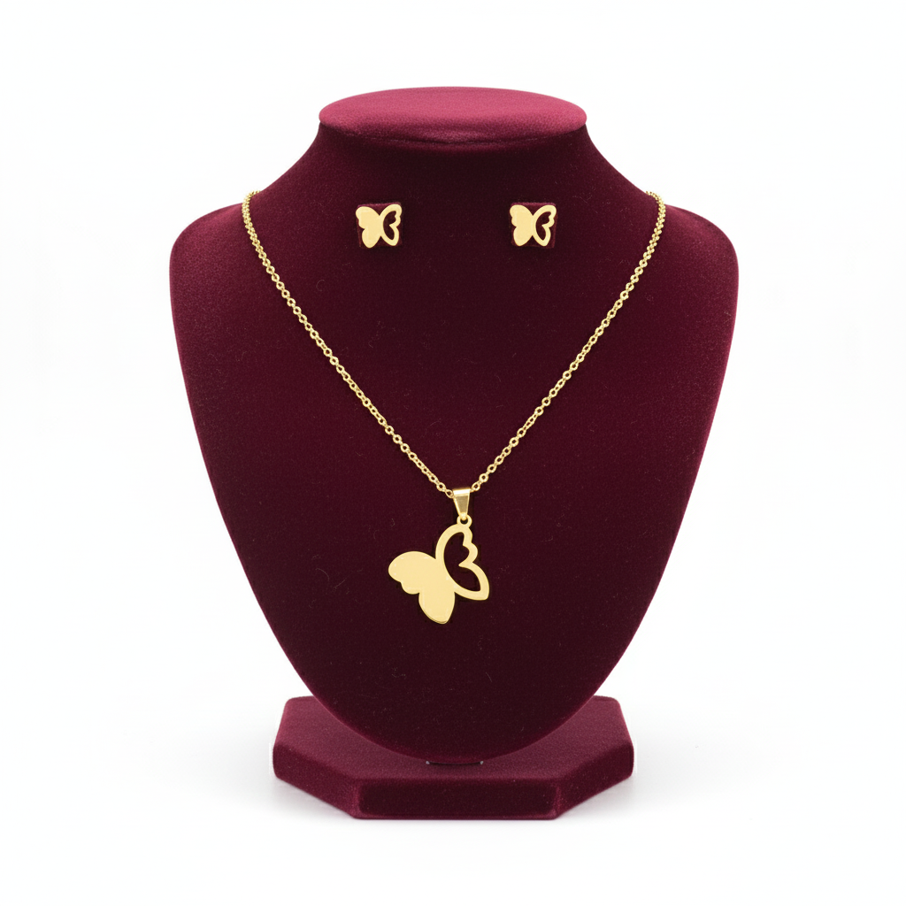 La bisutería fina se ha convertido en una de las mejores opciones para quienes buscan combinar estilo, elegancia y resistencia. Desde hace tiempo me he enamorado de los accesorios elaborados en acero inoxidable, y uno de mis favoritos es un set de aretes tipo topitos y collar con diseño de mariposa a media silueta, disponible en color dorado o plateado.