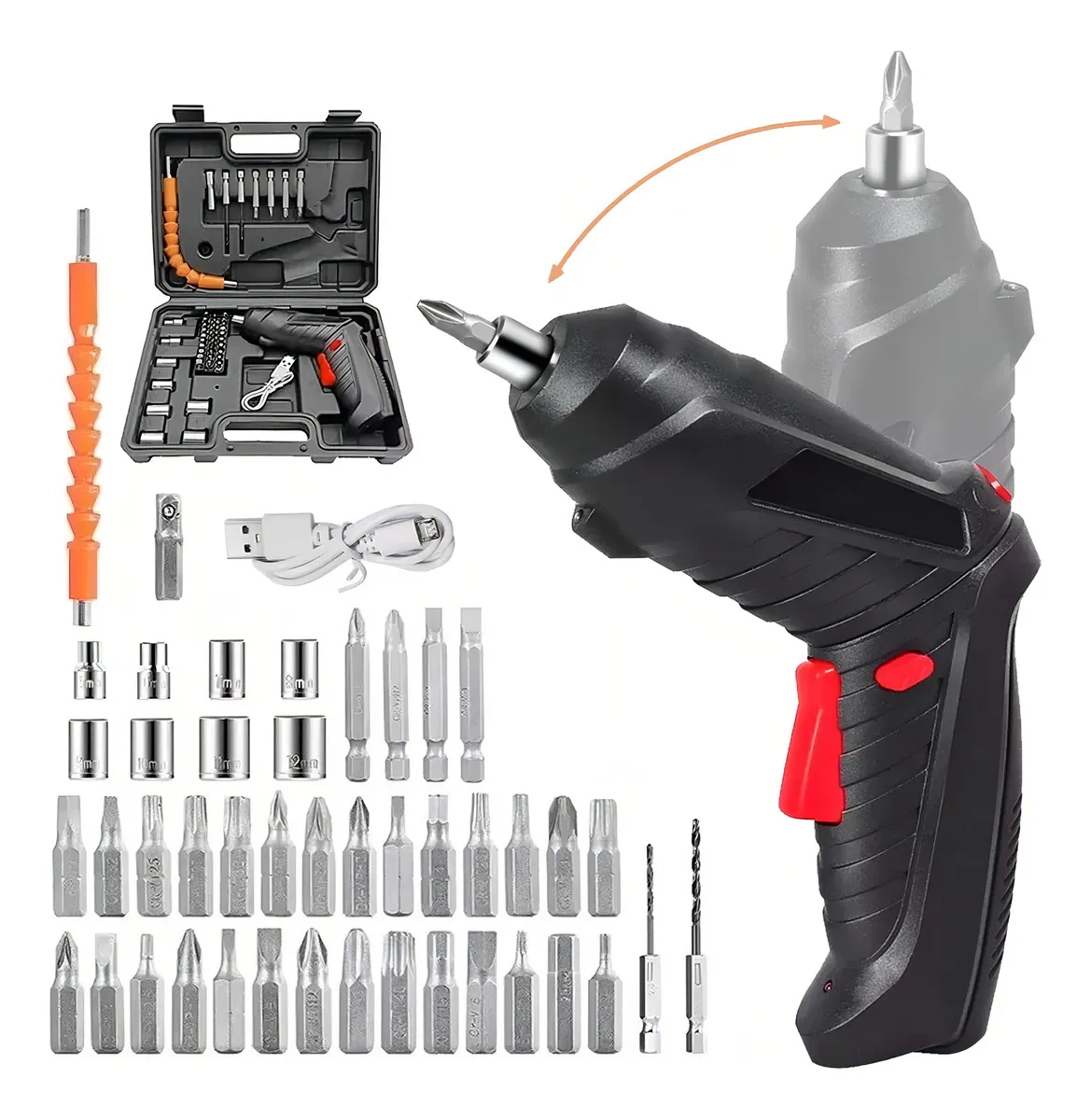 El destornillador eléctrico está hecho de materiales de alta calidad y se somete a estrictas pruebas de calidad para garantizar la seguridad y fiabilidad durante el uso. Equipado con una luz frontal LED, se ilumina automáticamente cuando el taladro eléctrico está en funcionamiento, proporcionando una guía clara a tu objetivo y haciendo que tu trabajo sea más seguro en espacios oscuros o estrechos. Adopta baterías recargables, sin necesidad de reemplazar las baterías, ahorrándote tiempo y energía. Con una gran capacidad de 1300 mAh, la batería se carga rápidamente y proporciona un uso duradero, lo que le permite completar tareas de manera más eficiente, sin la molestia de cambios frecuentes de batería. Mango giratorio de 90°-180° y 2 interruptores laterales, el mango súper giratorio del destornillador eléctrico proporciona un agarre cómodo en espacios reducidos. Interruptor de avance/retroceso para apretar y descargar fácilmente. ¿PARA QUÉ ME SIRVE EL PRODUCTO? El destornillador eléctrico de alto rendimiento ofrece una potente unidad para tus proyectos. El par eléctrico máximo del destornillador eléctrico es de 3,5 Nm, equipado con un soporte magnético para puntas y 15 puntas de destornillador diferentes, que atienden a varios requisitos de trabajo. Ya sea renovación del hogar o proyectos profesionales, este destornillador eléctrico maneja sin esfuerzo cualquier desafío. CARACTERÍSTICAS: •Juego de destornilladores inalámbricos recargables •Par máximo: 3.6 N.m •Tamaño del mandril: 1/4 de pulgada •Forma de mano: 120° o 180° •Ajuste de par: 6+1 ajustes de par •Luz LED: Luz de trabajo •1 X Destornillador eléctrico. •45 X Accesorios •1 X Cable USB CONTENIDO: 29 piezas de brocas de 25 mm, 1 pieza de varilla de extensión, 4 piezas de brocas de 50 mm, 8 piezas de llaves de tubo, 2 piezas de brocas y 1 pieza de cabezal de conversión. Una línea completa de accesorios para el destornillador eléctrico inalámbrico hace que sea fácil de usar. Al mismo tiempo, su peso ligero y su apariencia de diseño único. Nota: 1.Puede haber una diferencia debido a la medición manual. (MEDIDAS APROXIMADAS) 2.El color de los elementos reales puede diferir ligeramente de las imágenes de la lista debido a la pantalla de la computadora diferente, gracias por su comprensión. 3.Imagen sujeta a cambios.