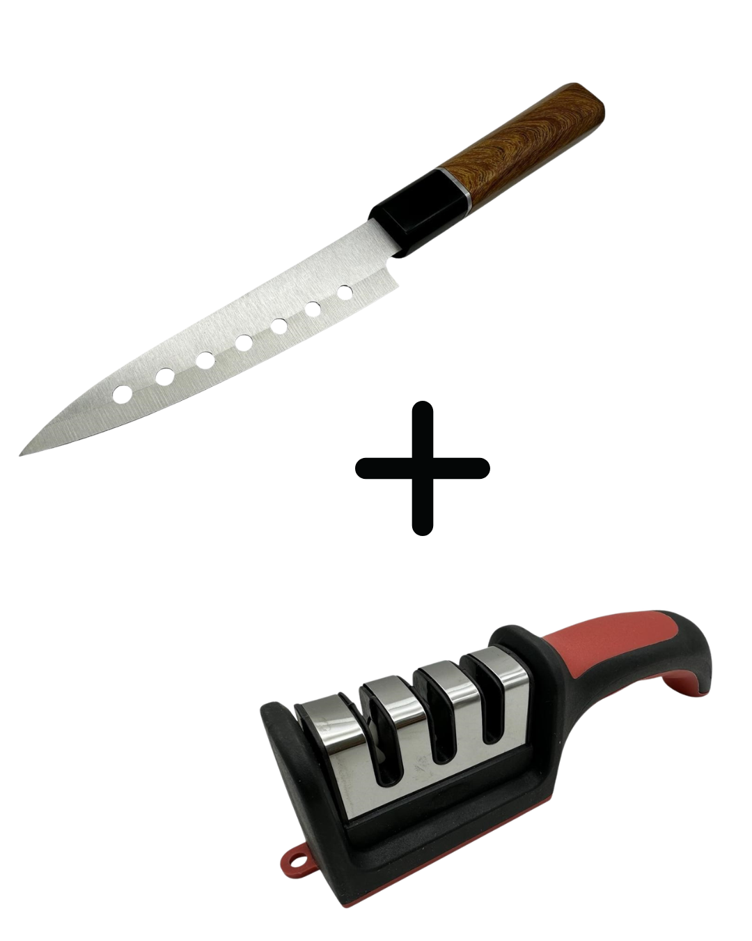 El Combo Cuchillo + Afilador es la opción perfecta para mantener cortes precisos, rápidos y seguros en la cocina. Incluye un cuchillo de acero inoxidable de excelente rendimiento y un afilador manual que permite conservar el filo por más tiempo de manera fácil y segura.