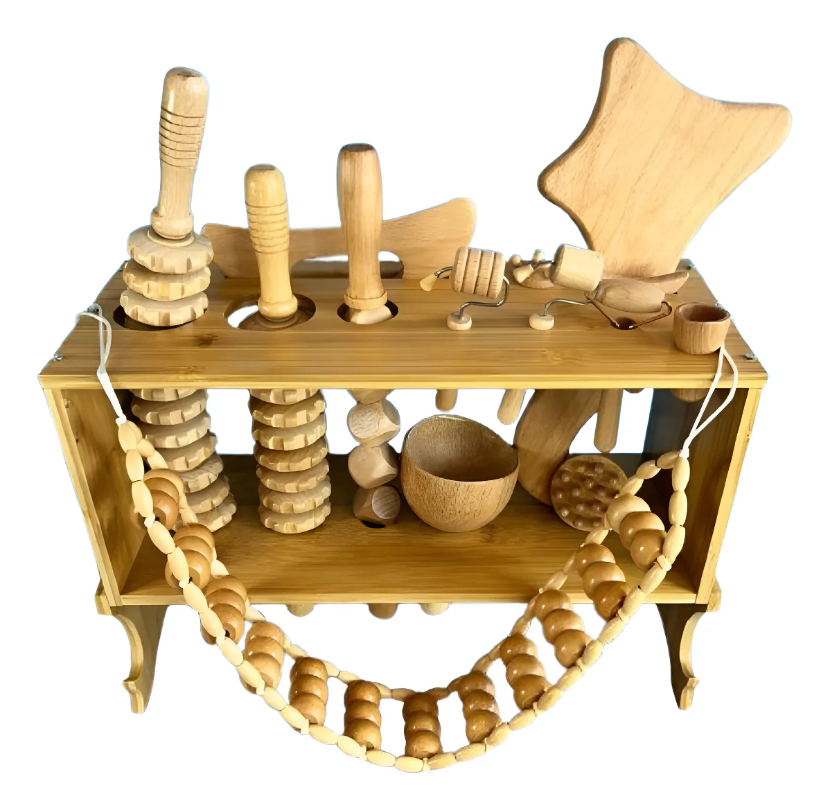 Kit de Madero terapia 14 pcs, con las siguientes características detalladas: Material: Está elaborado completamente en madera natural, lo que garantiza durabilidad, resistencia y un acabado ecológico. Las piezas tienen un diseño liso y pulido para evitar astillas y proporcionar un tacto suave y agradable. Contenido del set: Herramientas de masaje de diferentes formas y tamaños para distintas funciones. Rodillos con texturas variadas, ideales para masajes relajantes, estimulantes o terapéuticos. Un cuenco de madera para almacenar objetos pequeños del set. Un accesorio con cuentas de madera en forma de collar o cuerda, diseñado para masajes de mayor alcance, como en la espalda. Base organizadora: Incluye una base de madera con compartimentos y soportes diseñados específicamente para organizar y guardar las herramientas, manteniéndolas en orden y listas para su uso. Funcionalidad: Este set está pensado para masajes corporales en zonas como la espalda, piernas, pies, brazos y cuello. Las herramientas están diseñadas para aliviar tensiones musculares, mejorar la circulación sanguínea y estimular la relajación. Diseño ergonómico: Cada herramienta tiene formas cuidadosamente diseñadas para adaptarse a la anatomía del cuerpo humano y permitir un agarre cómodo durante su uso. Estilo decorativo: Su diseño rústico y minimalista en madera lo hace atractivo como pieza decorativa, además de funcional. Portabilidad: Al ser compacto y estar organizado en una base, es fácil de transportar, lo que lo hace práctico para uso doméstico, profesional o incluso en viajes. Uso versátil: Ideal para terapia de masajes, sesiones de relajación personal o incluso en entornos de spa y fisioterapia.