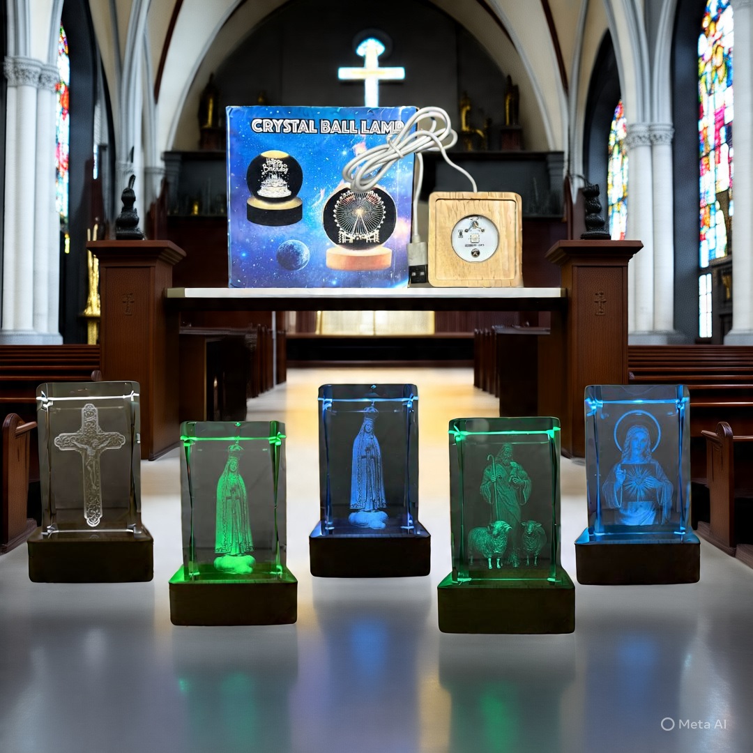 La Lámpara de Cristal Grande Cuadrada combina luz LED de colores cambiantes con estilos de imágenes religiosas, ideal para ambientar tus espacios con calma y significado.