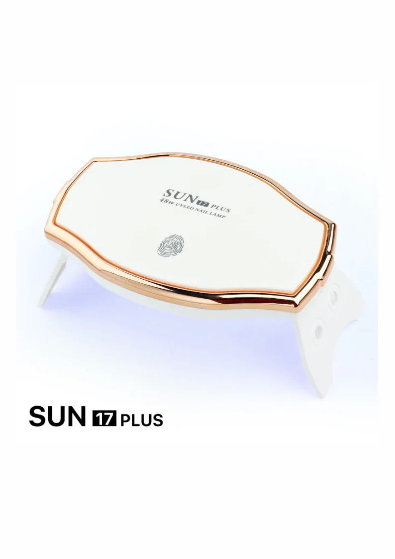 El producto mostrado es la lámpara de uñas SUN 17 PLUS, una mini lámpara UV/LED recargable y plegable diseñada para la polimerización de geles y esmaltes.