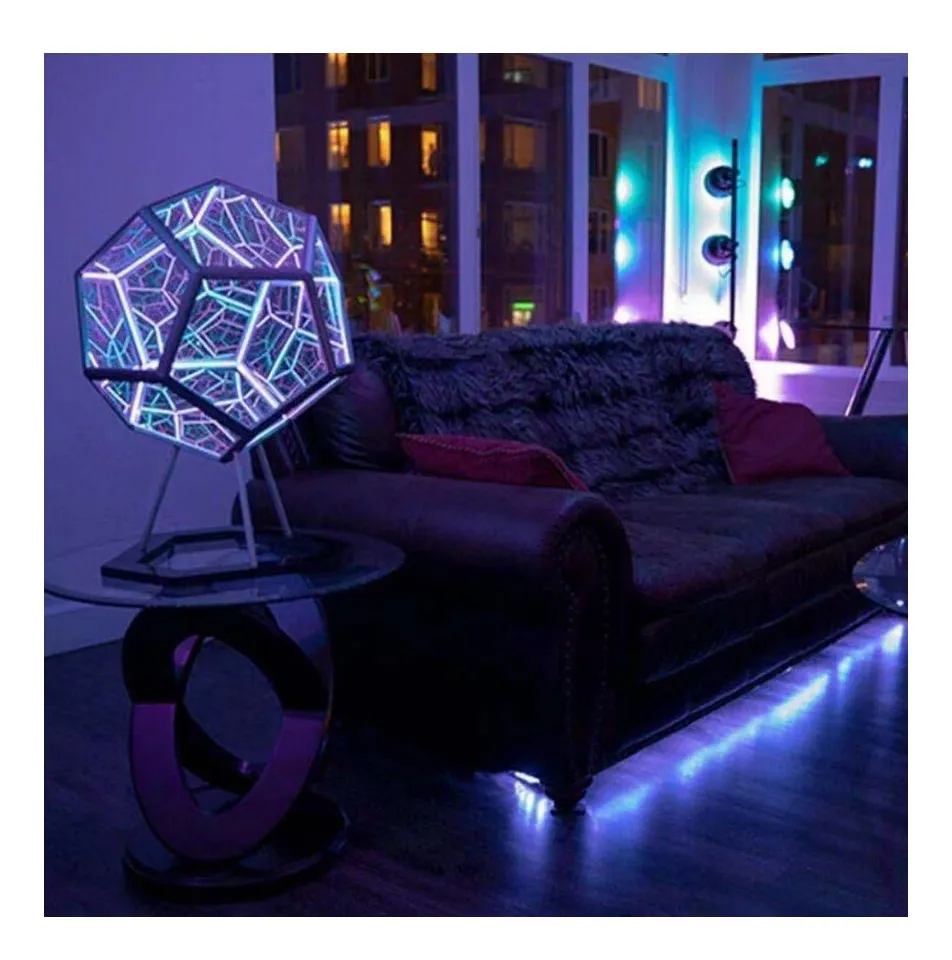 Diseño: alojado en un marco de 12 caras, una carcasa de plástico y acrílico, espejos de vidrio de 2 vías a medida y placas de circuito impresas a medida a la máxima densidad para un total de 960 LED, mostrando docenas de modos de iluminación y animaciones escritos a medida. Tamaño: 7.9* 7.9* 7.9 in, modo de fuente de alimentación USB. Iluminación suave y regulable: puede ajustar varios colores suaves y regulables que les gustan a adultos y niños. Deje que los niños se sientan seguros y sorprendidos por la noche. La potencia de la fuente de luz es de 5 (W). El cable de carga está conectado a la fuente de alimentación y se puede iluminar durante mucho tiempo. Material de alta calidad: hecho de plástico y metal de alta calidad, duradero y no se decolora fácilmente.