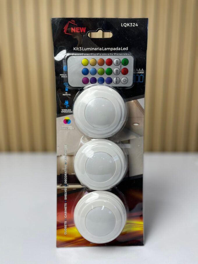 El kit de lámparas LED modelo LQ324 incluye tres luminarias compactas de diseño circular con control remoto inalámbrico. Están diseñadas para iluminación auxiliar en interiores, especialmente en espacios como clósets, gabinetes, estantes y áreas decorativas. Cada unidad puede instalarse fácilmente mediante adhesivo, ofreciendo practicidad sin necesidad de cableado.