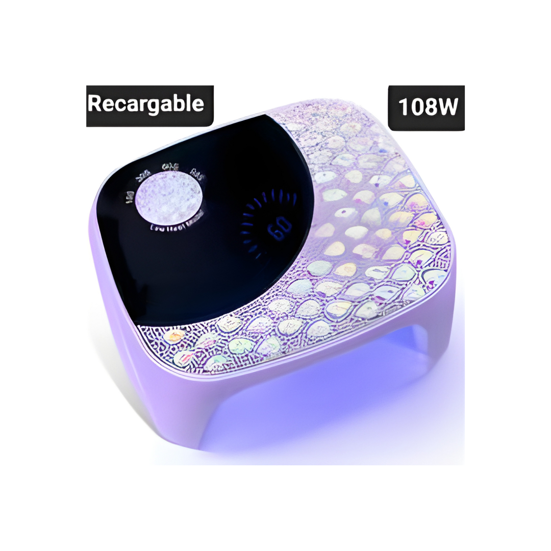 Lámpara profesional 48W con batería recargable en color lila. Su diseño envolvente de perla y tecnología UV LED garantiza el curado completo y uniforme de geles y esmaltes semipermanentes. Es ideal para trabajos portátiles. Cuenta con sensor automático, temporizador y base desmontable.