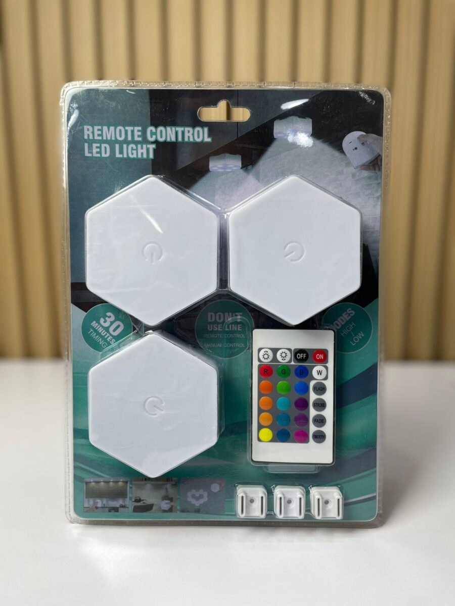 El kit de lámparas LED modulares con control remoto (modelo hexagonal tipo “tap”) es un sistema de iluminación decorativa diseñado para uso interior. Cada módulo funciona como lámpara táctil individual, con opción de control remoto para encendido, apagado, ajuste de brillo, selección de color y modos de iluminación. Su diseño geométrico hexagonal permite instalación personalizada, tanto en paredes como en techos, ofreciendo un efecto decorativo y funcional.