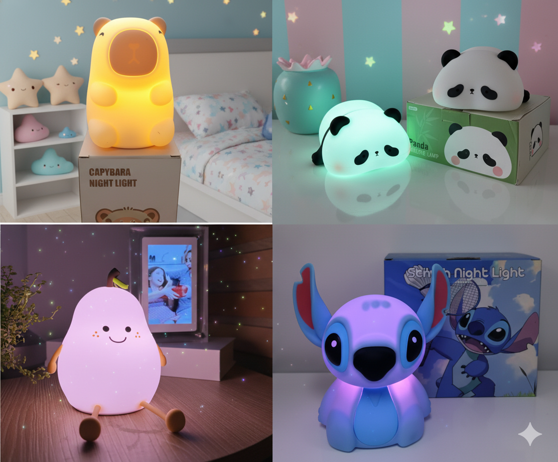 Lámpara de silicona recargable con 7 colores RGB, luz suave, material anti-golpes y temporizador de 30 y 60 minutos. Disponible en diseños adorables: Stitch, Capibara, Panda y Pera. Ideal para niños, decoración y regalos.