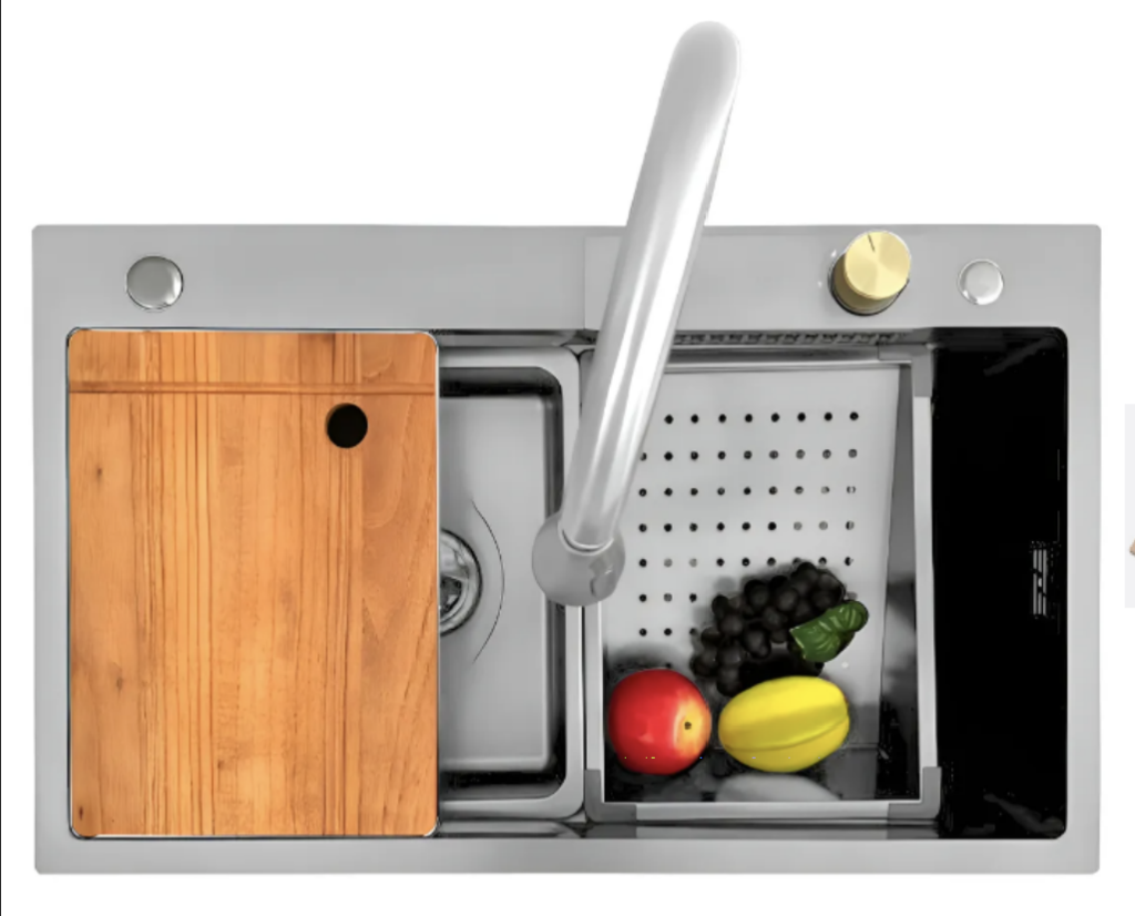 Lavaplatos multifuncional FA1 Silver 75×45×22 cm, en acero inoxidable premium. Incluye grifo, dispensador, colador y tabla. Diseño tipo estación de trabajo para cocinas modernas. Elegancia, funcionalidad y resistencia.