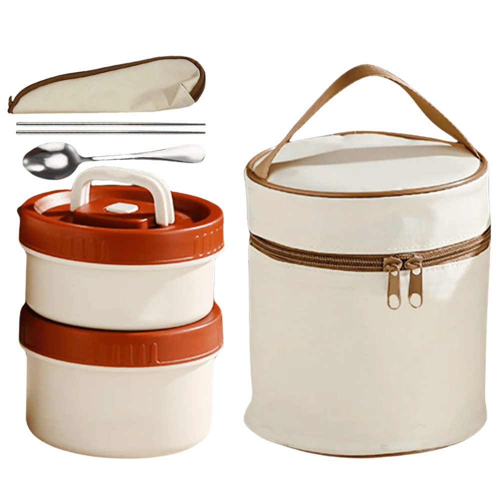 El conjunto incorpora un bolso térmico con cierre y asa de transporte, diseñado para facilitar el traslado. Los recipientes se acomodan dentro del estuche, ayudando a mantener el orden y permitiendo transportar la comida al trabajo, estudio o actividades fuera de casa.