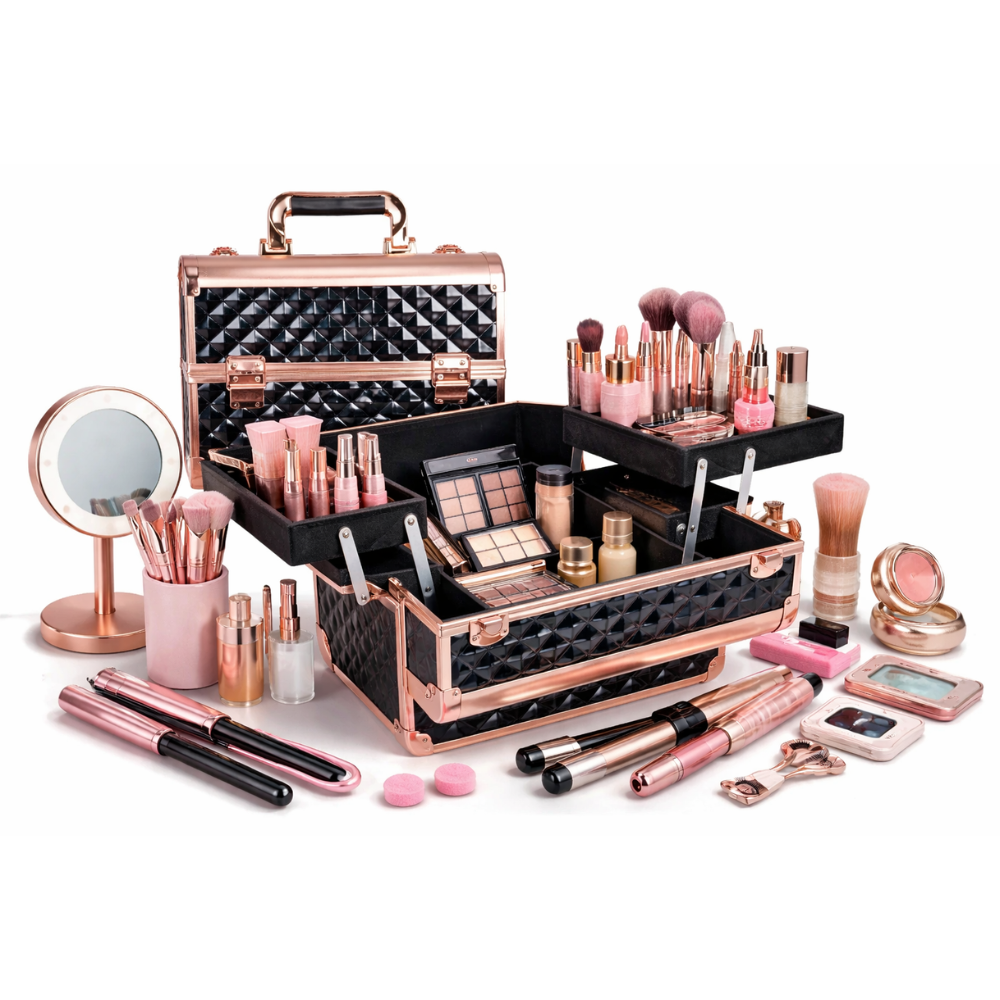 Su estructura con compartimentos expandibles y bandejas internas permite almacenar y transportar maquillaje, brochas, paletas, esmaltes, accesorios y herramientas de belleza de forma ordenada y segura. Su diseño elegante y funcional lo hace ideal también para uso personal o viajes.