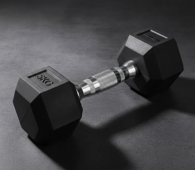 PESAS EN ACERO MACIZO FORRADAS O ENCAUCHETADAS EN GOMA DE ALTA CALIDAD MANCUERNAS EN FORMA HEXAGONAL PROFESIONALES DE 5 KG
