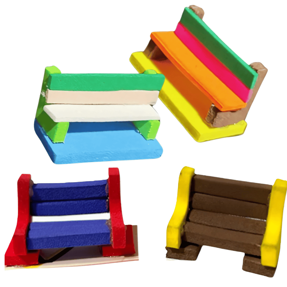 Maqueta Sillas Parque ideal para proyectos escolares, trabajos manuales y actividades educativas. Diseñada para complementar maquetas de espacios públicos, parques y escenarios urbanos en exposiciones o tareas.