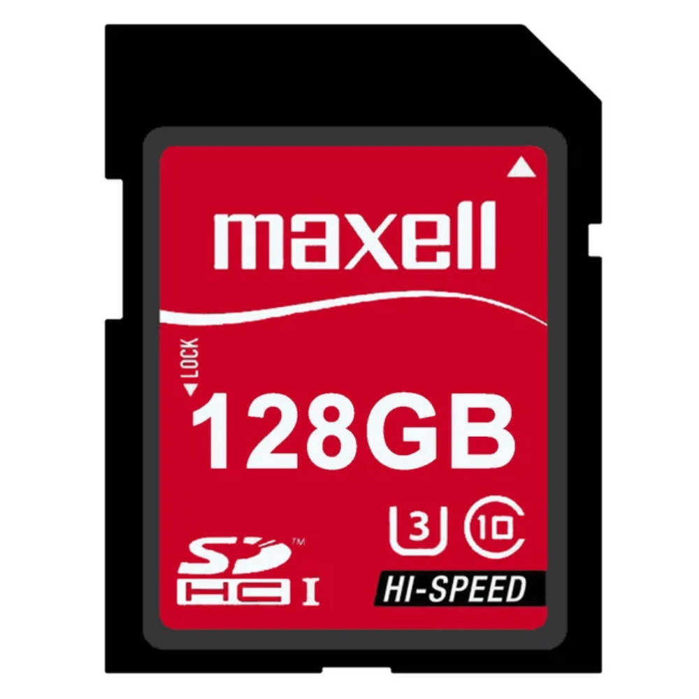 Memoria SD Maxell 128GB diseñada para almacenamiento seguro de fotos, vídeos y archivos digitales en cámaras fotográficas, cámaras de vídeo, portátiles y otros dispositivos compatibles con formato SD.