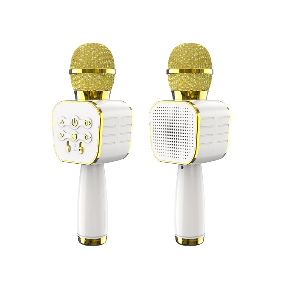 DESCRIPCCION Este micrófono con altavoz integrado ofrece una solución de audio compacta para entretenimiento. Presenta un diseño con acabado brillante en el cabezal y una interfaz de usuario situada en el cuerpo central del dispositivo. A través de sus controles se puede gestionar el nivel de salida de audio y la profundidad del efecto de eco. El dispositivo admite conexión inalámbrica con diversos sistemas operativos y también cuenta con entrada para conexiones cableadas. La batería interna proporciona autonomía para el uso en interiores o exteriores, cargándose de forma sencilla a través de fuentes de energía USB comunes.