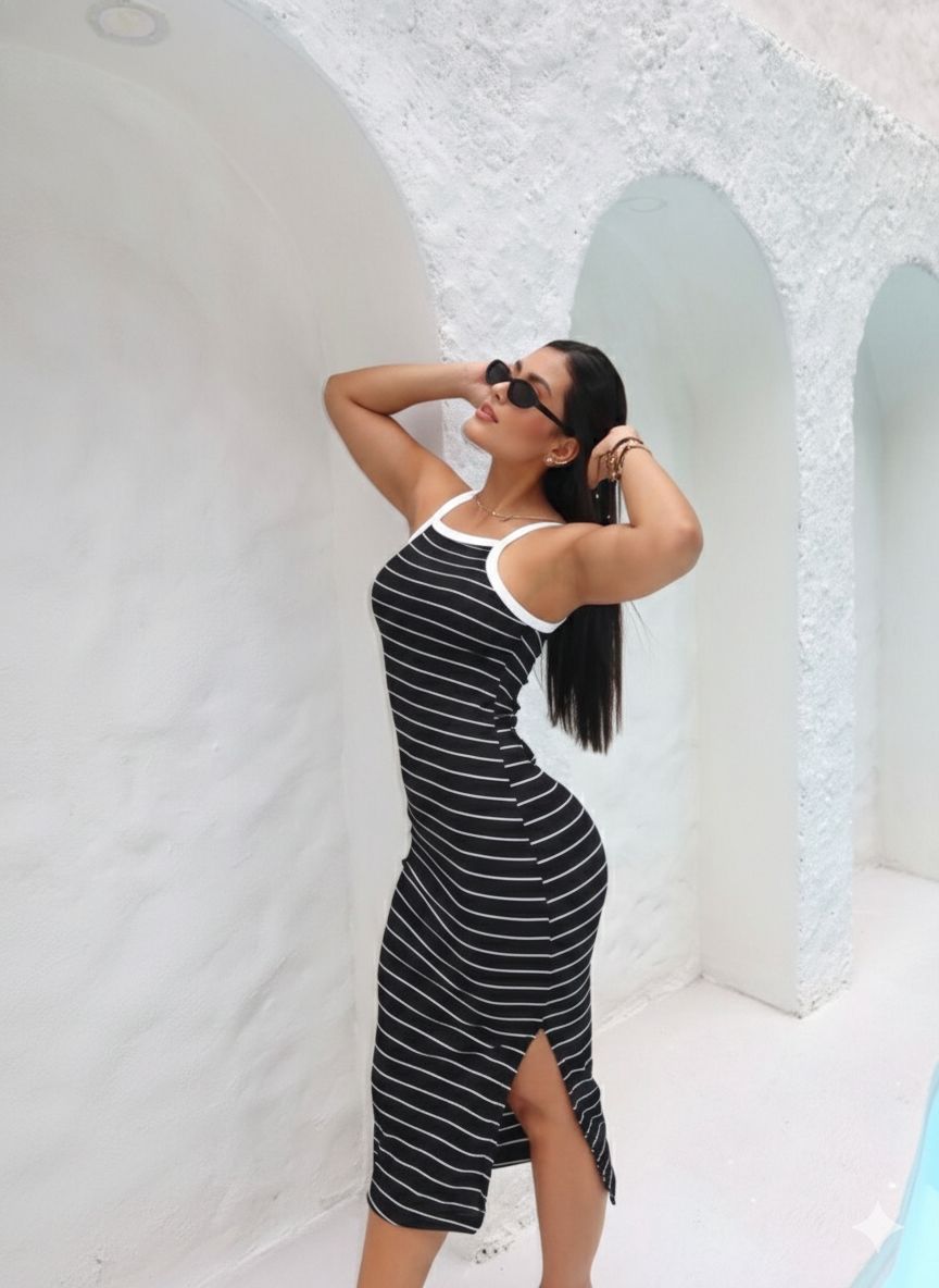 El Vestido MIDI Kim Rayas está elaborado en tela rip de alta calidad, con excelente elongación, lo que permite que se ajuste suavemente al cuerpo y se adapte cómodamente hasta la talla L. Su diseño con rayas blancas y abertura lateral aporta un toque moderno y estilizado, resaltando la silueta sin perder comodidad, ideal para el uso diario o para ocasiones especiales.