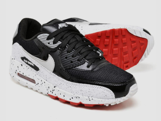 Tenemos las Air Max 90 que lucen un patrón de cemento en el guardabarros y la suela. También presentan charol negro y malla del mismo color, y detalles rojos en el cierre. Es innegable que este diseño se asemeja mucho a las últimas Air Jordan 2 "Infrared 23 ".