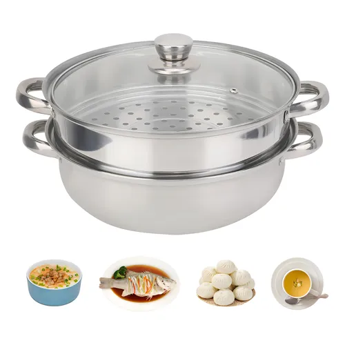Esta olla vaporera de acero inoxidable de dos niveles con tapa de vidrio permite cocinar alimentos al vapor de forma saludable.