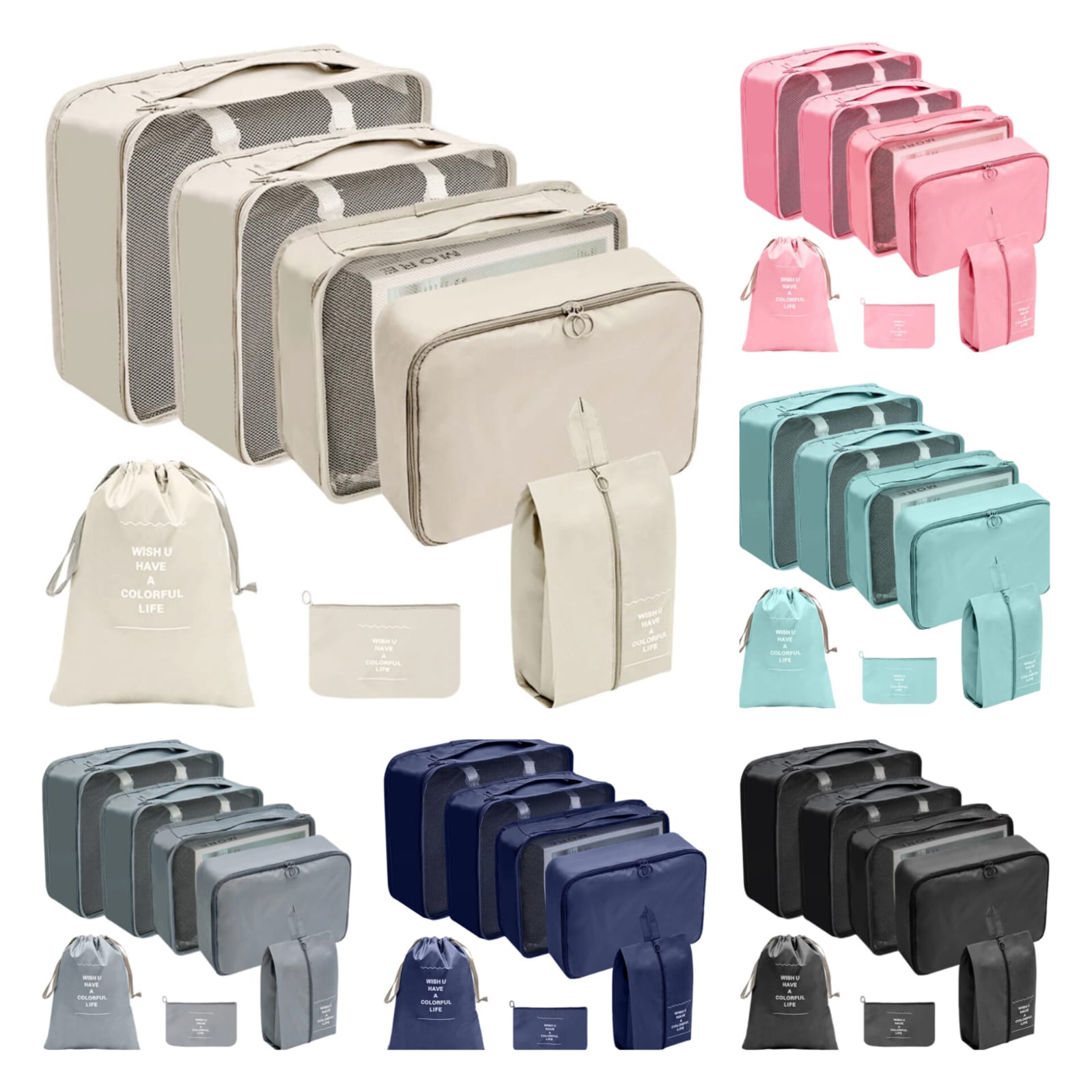 Juego de siete piezas: un conjunto de 7 bolsas de viaje de alto volumen en diferentes tamaños para almacenar surtido de ropa, lavandería sucia, sujetadores, ropa interior, zapatos, cosméticos, toallas, artículos de tocador y accesorios electrónicos.