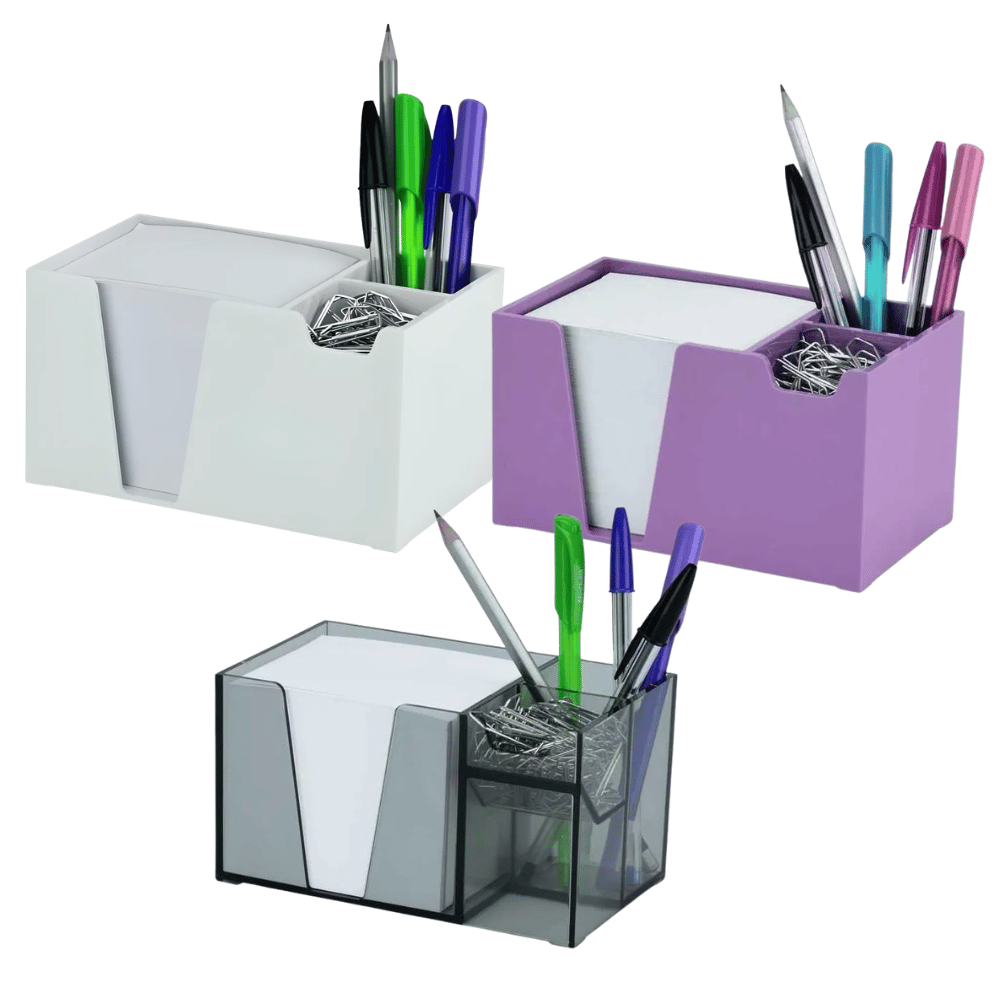 Organizador de escritorio de plástico con diseño práctico y funcional, ideal para mantener el espacio de trabajo ordenado. Cuenta con divisiones que permiten almacenar bolígrafos, lápices, clips, notas y pequeños accesorios