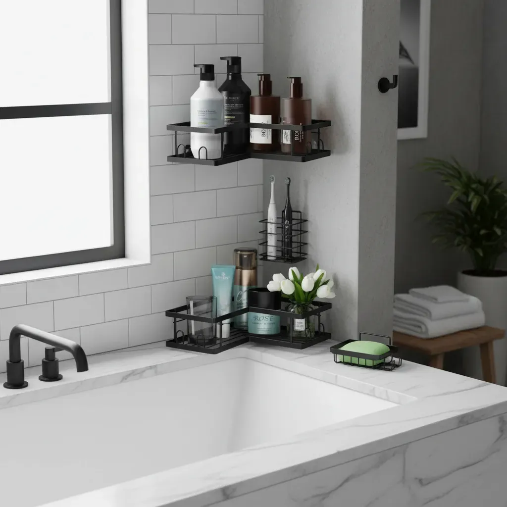 Optimiza el espacio de tu baño con este set organizador de 4 piezas, ideal para mantener tus productos de higiene y belleza siempre ordenados y al alcance. Su diseño moderno y funcional se adapta a cualquier estilo de baño. ESPECIFICACIONES - Incluye: 2 esquineros, 1 portacepillos y 1 jabonera. - Color: Negro. - Material: Metal resistente. - Instalación: Montaje en pared (adhesivo o tornillos, según preferencia). USOS RECOMENDADOS Perfecto para organizar champús, cremas, cepillos de dientes, jabones y otros accesorios. Ideal para baños pequeños o grandes, brindando mayor orden y aprovechamiento del espacio. VENTAJAS - Resistente a la humedad. - Fácil de limpiar. - Diseño elegante y minimalista. Sin garantía