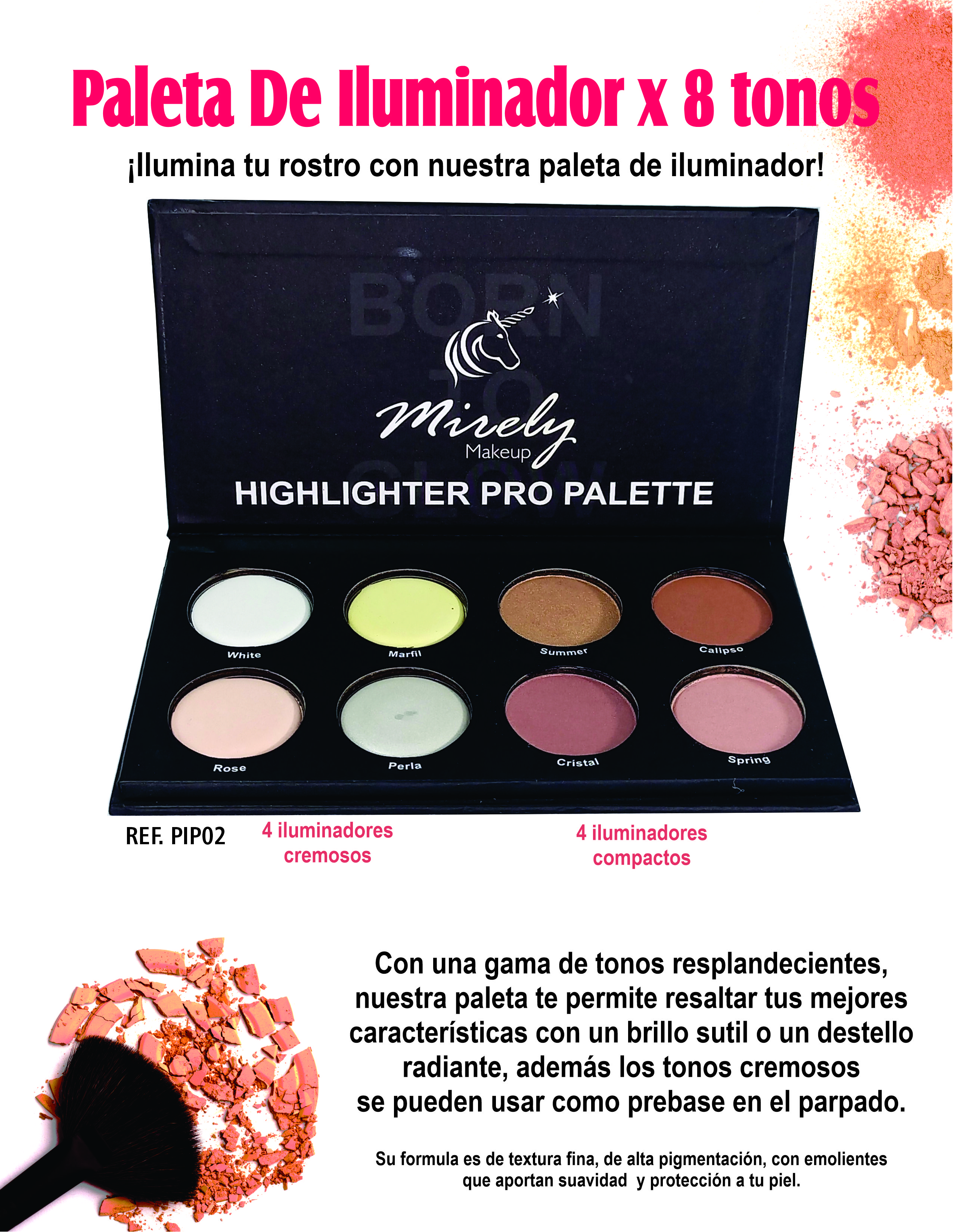 Modo de uso: después de aplicar base y corrector, selecciona un tono cremoso y tómalo con los dedos o una esponja húmeda, colocándolo a toques en las zonas altas del rostro como pómulos, puente de la nariz y arco de cejas, luego difumina suavemente para un efecto seamless. Para mayor intensidad, superpón un tono compacto con una brocha de abanico o puff, barriéndolo ligeramente sobre las áreas ya iluminadas sin sobrecargar. Puedes usarla también en párpados, labios o cuerpo para looks completos, y fija con spray si buscas duración extra en eventos largos
