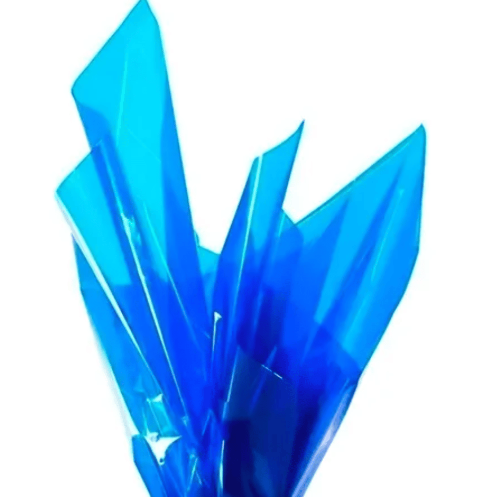Papel celofán color azul ideal para decoraciones, manualidades, envoltura de regalos y trabajos escolares. Su acabado translúcido permite crear efectos de color y brillo en proyectos creativos y decorativos.