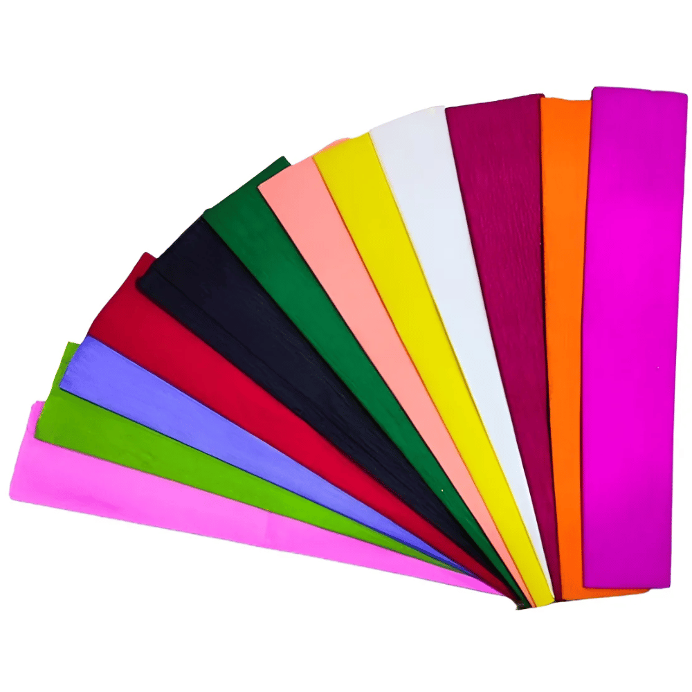 Papel crepe en presentacion de paquete por 10 hojas con variedad de colores, ideal para proyectos creativos, decoraciones y trabajos escolares. Su textura flexible permite moldear, estirar y dar volumen para crear diferentes formas y elementos decorativos.