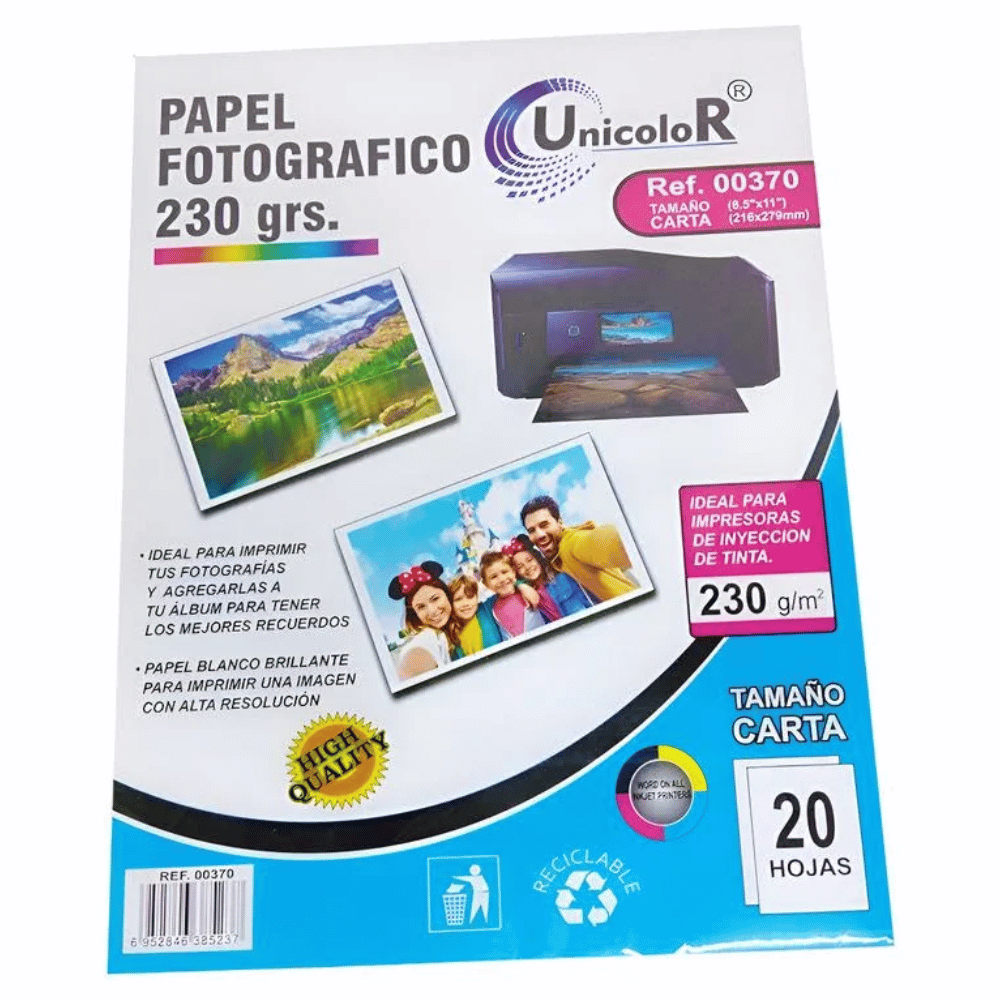 Papel fotográfico unicolor de 230 gramos en tamaño carta ideal para impresiones de imagen con buena definición y presentaciones visuales llamativas. Su superficie permite resaltar detalles, contrastes y colores en diferentes tipos de imágenes.