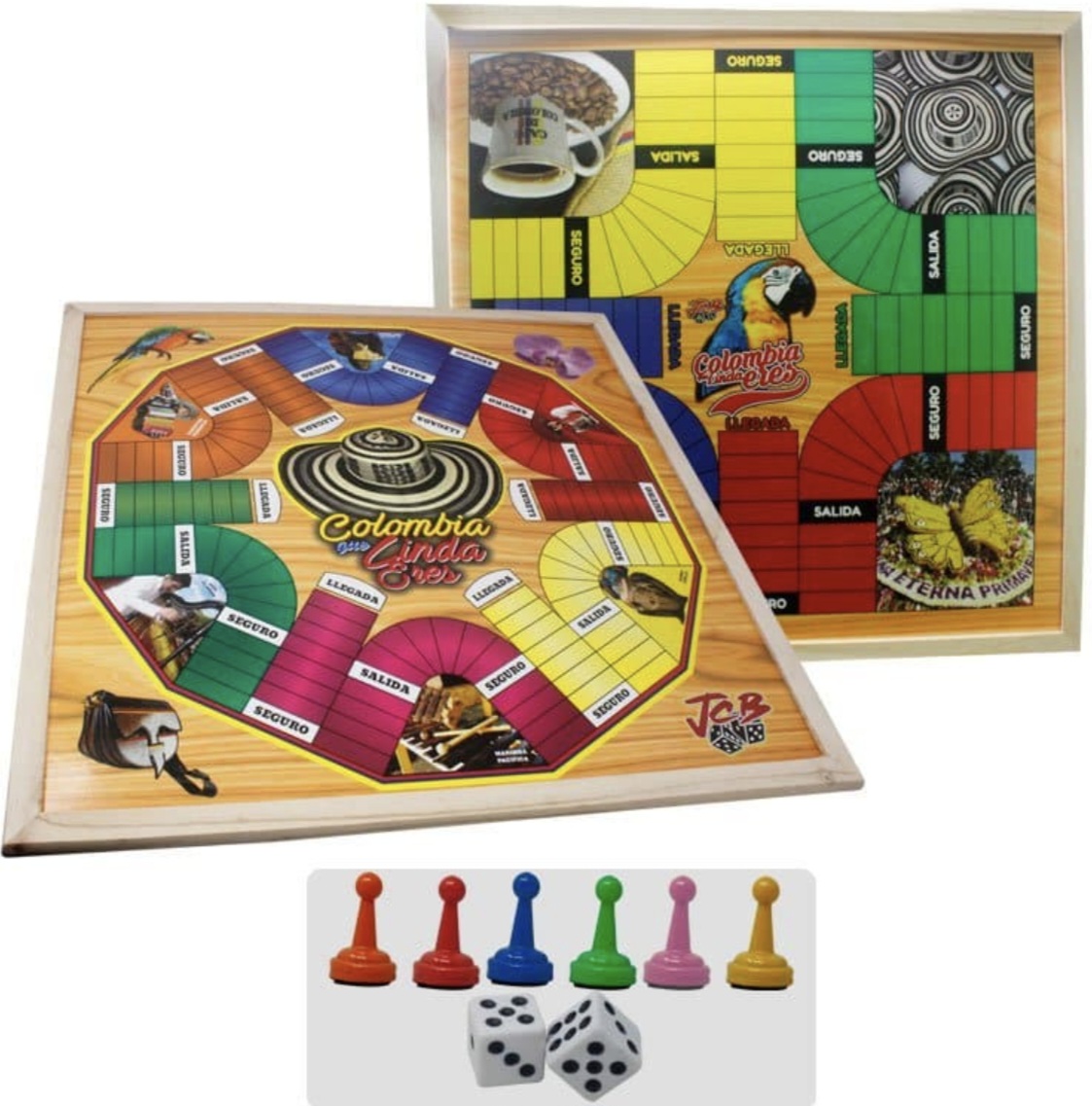 El artículo mostrado es un juego de mesa doble cara que combina el clásico Parqués colombiano y el juego de Serpientes y Escaleras.