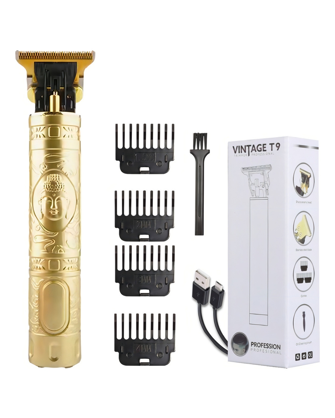 Características (medidas en cm) Tamaño aprox. 14 x 4 x 3 cm, potencia 5W, carga aprox. 3 horas y uso aprox. 120 minutos (según uso). Contenido de la caja Patillera T9, cable USB de carga, 4 peines guía, brocha de limpieza.