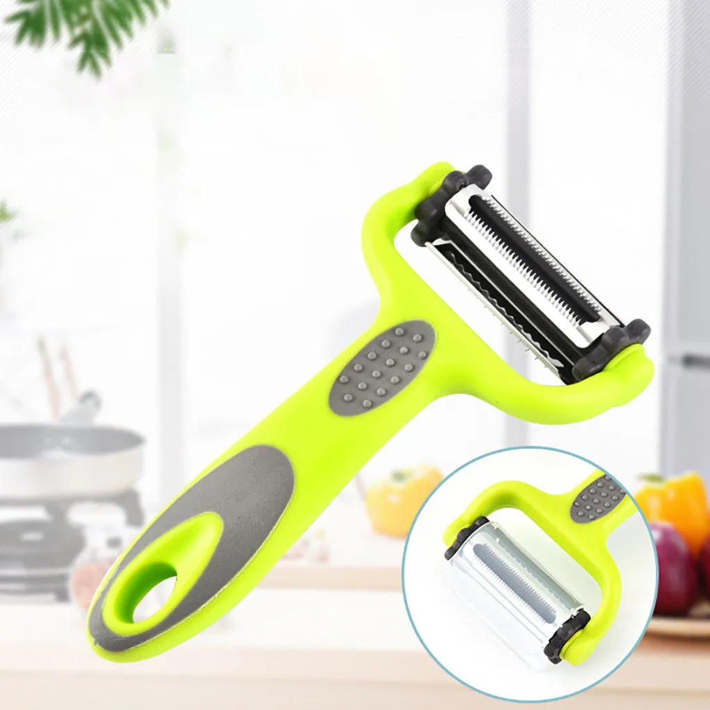 Este producto es un pelador de verduras multifuncional 3 en 1, diseñado para ahorrar espacio y ofrecer versatilidad en la cocina. Su característica principal es un cabezal giratorio de 360° que te permite alternar entre tres tipos de cuchillas diferentes según lo que necesites preparar.