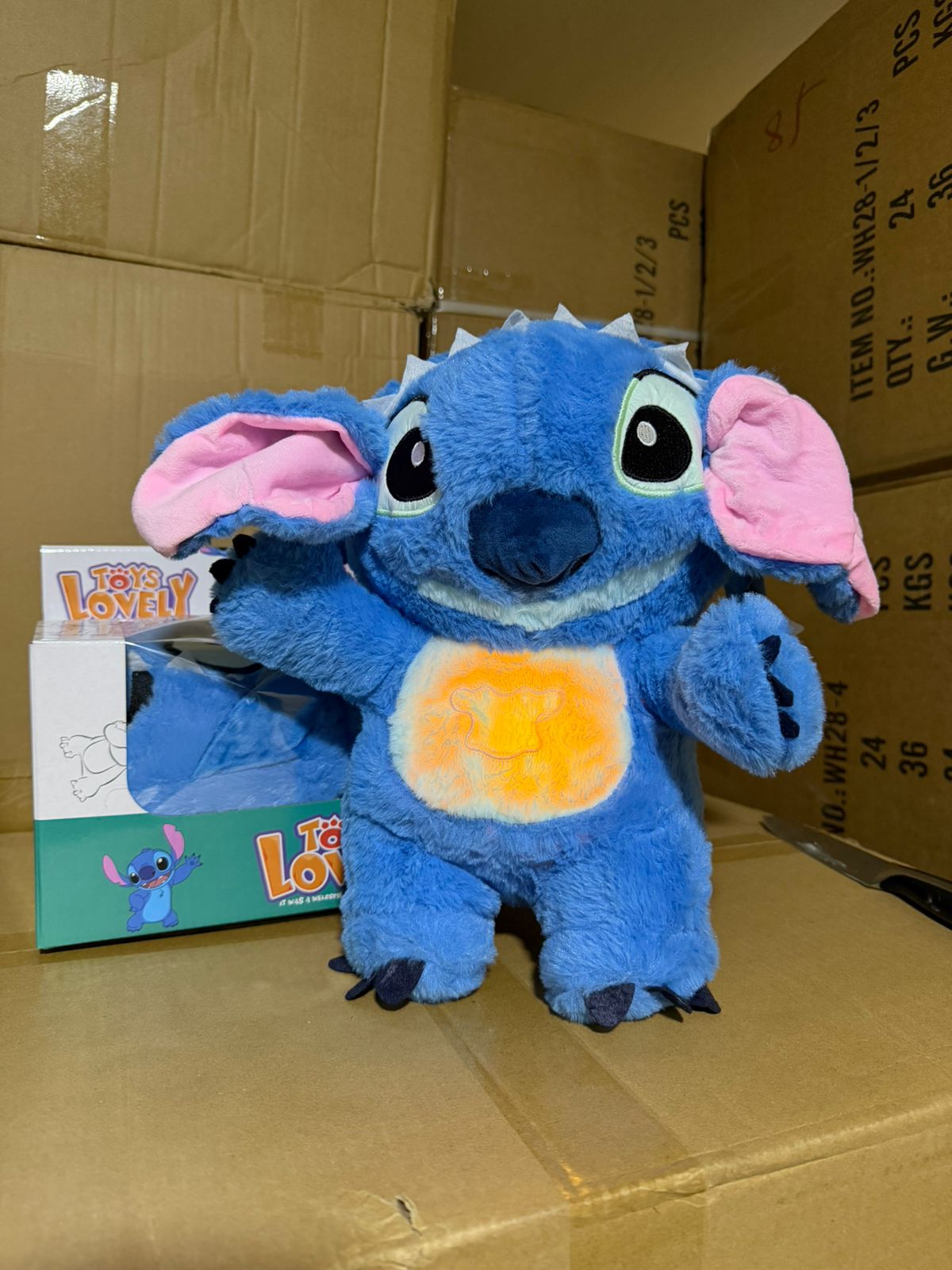 Tiene funcion de simular la respiracion, tiene luz en su barriga, tiene gorro, sonido y habla en español, color azul y rosado