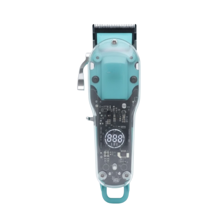 Peluquera recargable presentada en caja individual con diseño frontal visible. El equipo muestra cuerpo traslúcido. Incorpora pantalla digital frontal integrada en la estructura.