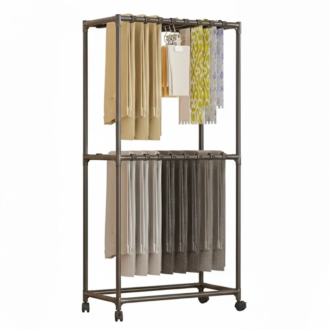 Perchero organizador doble con ruedas 🧥👖, ideal para optimizar espacios en habitaciones, vestidores o locales comerciales. Cuenta con doble barra colgante y niveles inferiores para mayor capacidad de almacenamiento 📦✨. Su estructura metálica resistente y ruedas giratorias facilitan el traslado y brindan estabilidad 🛞🔩. Práctico, funcional y perfecto para mantener tu ropa siempre ordenada. 👌🏻