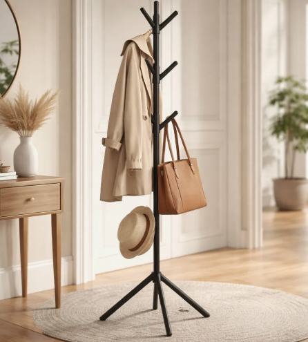 Organiza tu espacio con este perchero de pie metálico tipo árbol, ideal para hogares y oficinas. Su diseño moderno y funcional permite colgar abrigos, bolsos y accesorios de manera práctica y elegante. ESPECIFICACIONES - Altura: 160 cm - Ancho: 50 cm - Material: Metal resistente - Color: Negro - Estilo: Moderno - Número de ganchos: 8 USO DOMESTICO LEVE RECOMENDACIONES Perfecto para entradas, habitaciones o salas de espera. Fácil de armar y mover gracias a su estructura ligera. Limpia con un paño seco para mantener su acabado impecable. VENTAJAS Ahorra espacio y mantén el orden con un perchero estable y duradero, ideal para cualquier ambiente moderno.