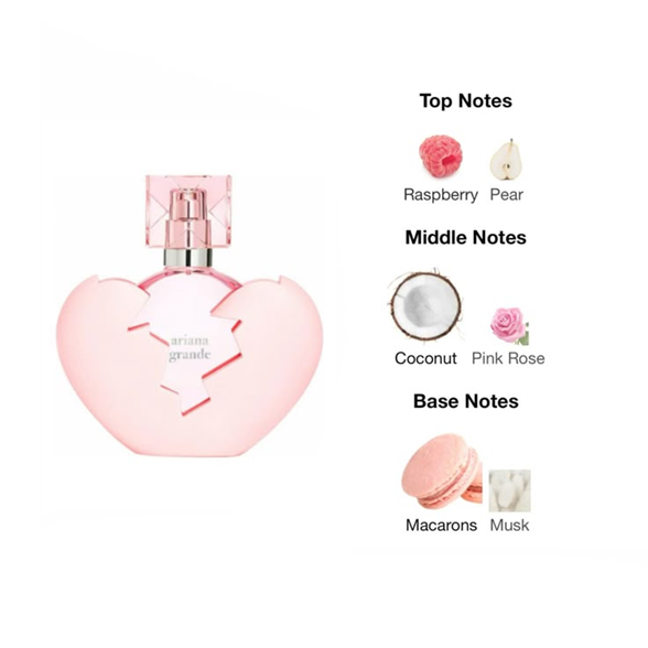 Thank U, Next Eau de Parfum de Ariana Grande es una fragancia dulce, moderna y femenina. Combina notas de frambuesa, coco cremoso y rosa con un fondo suave de macarons y almizcle. Su aroma juvenil y seductor crea una estela deliciosa, perfecta para destacar con estilo y personalidad. 💖✨