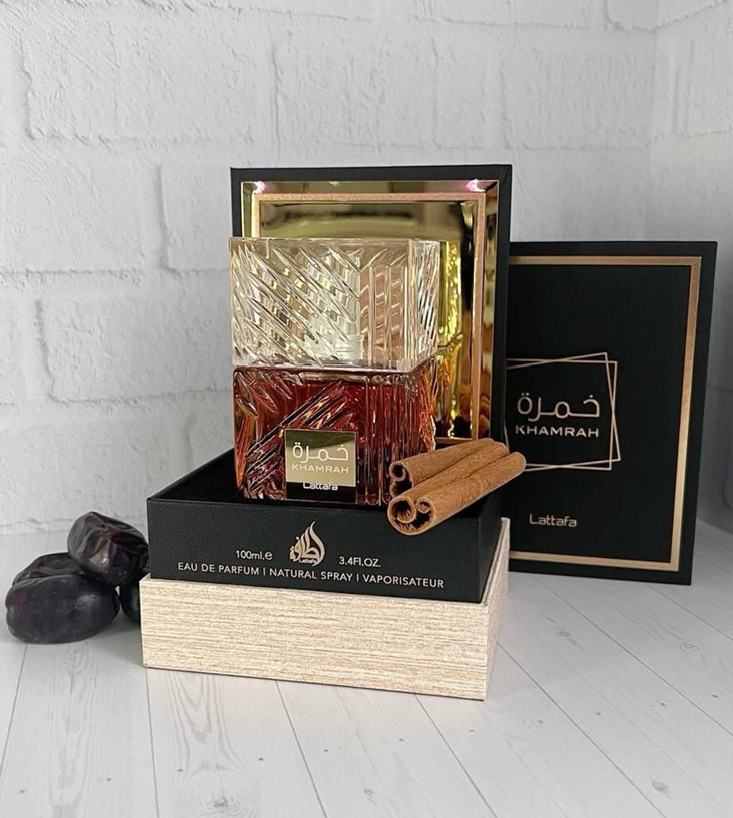 Khamrah de Lattafa, una joya de la perfumería árabe que evoca lujo y calidez. Su aroma es una mezcla exquisita de canela, dátiles y praliné, creando una fragancia gourmand, especiada y opulenta que se siente como un abrazo dulce y sofisticado.