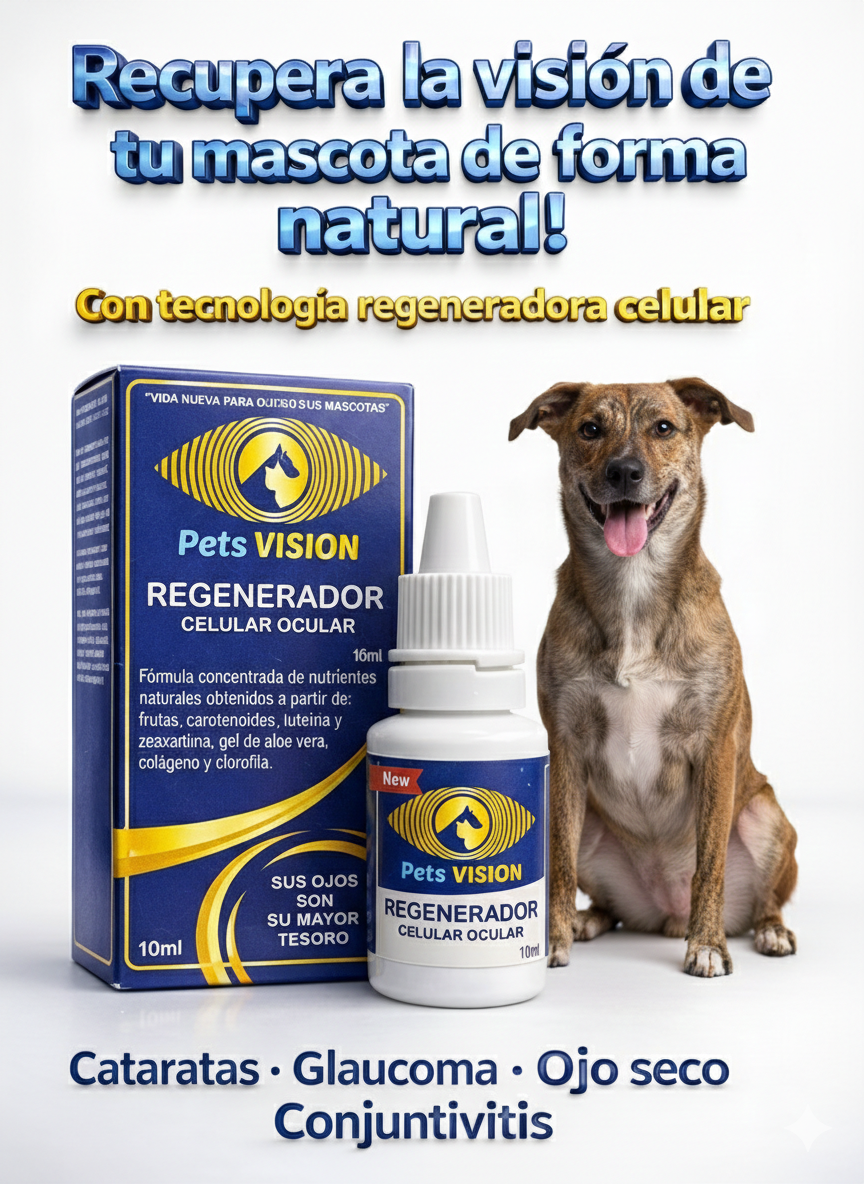 Pets Visión es un regenerador celular ocular natural diseñado específicamente para caninos y felinos. Su fórmula innovadora está compuesta por ingredientes naturales que ayudan a tratar problemas oculares como conjuntivitis, cataratas, glaucoma y ojo seco. Este producto no solo alivia los síntomas, sino que también protege y regenera los tejidos oculares, mejorando significativamente la calidad de vida de tu mascota. Con resultados visibles en pocos días, Pets Visión es la solución ideal para el cuidado ocular de tus amigos peludos.